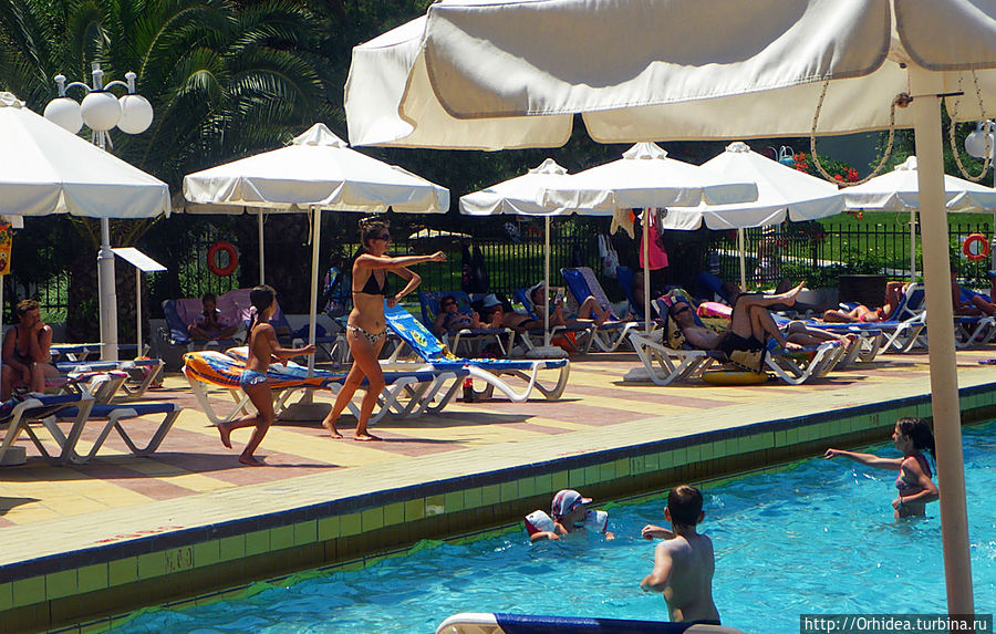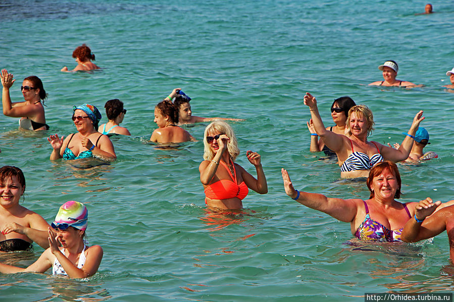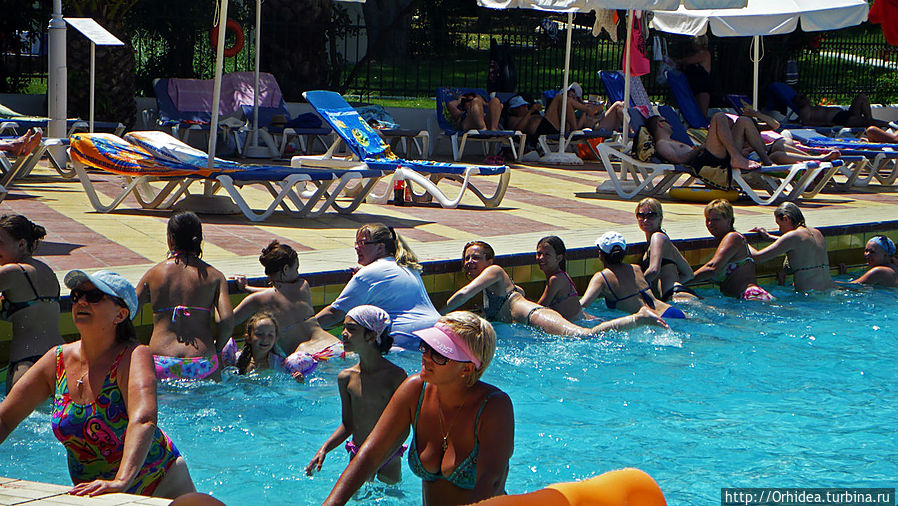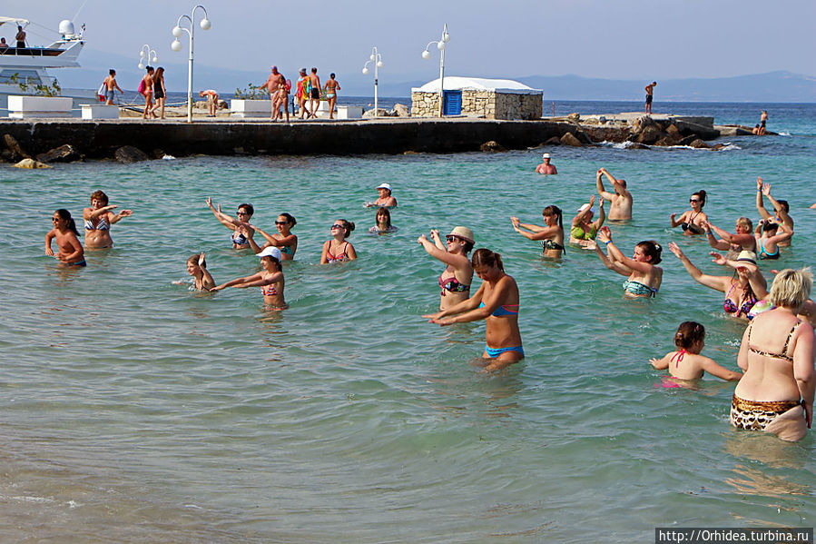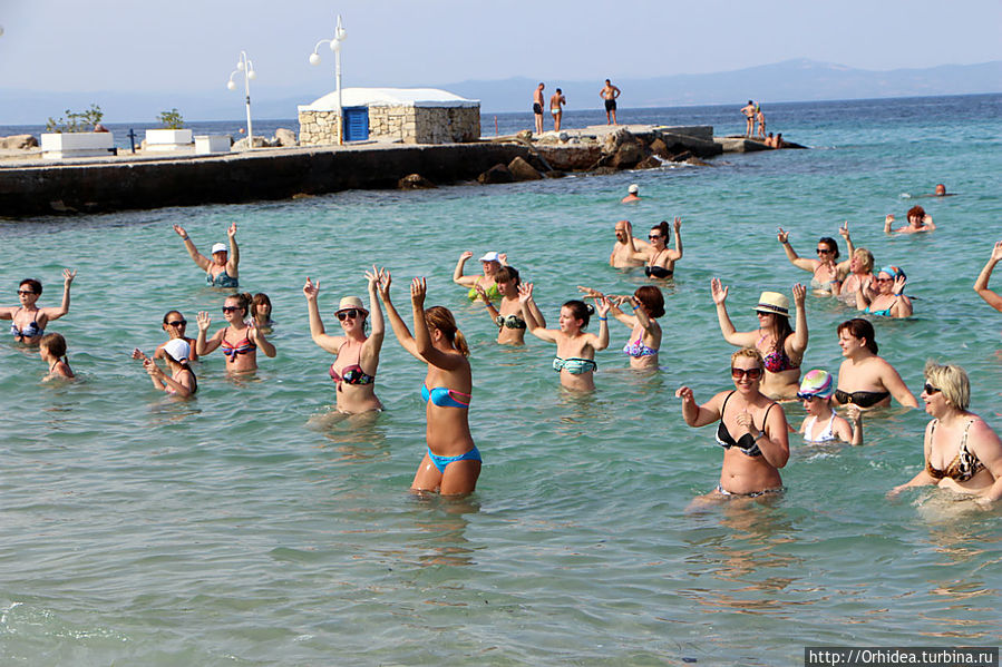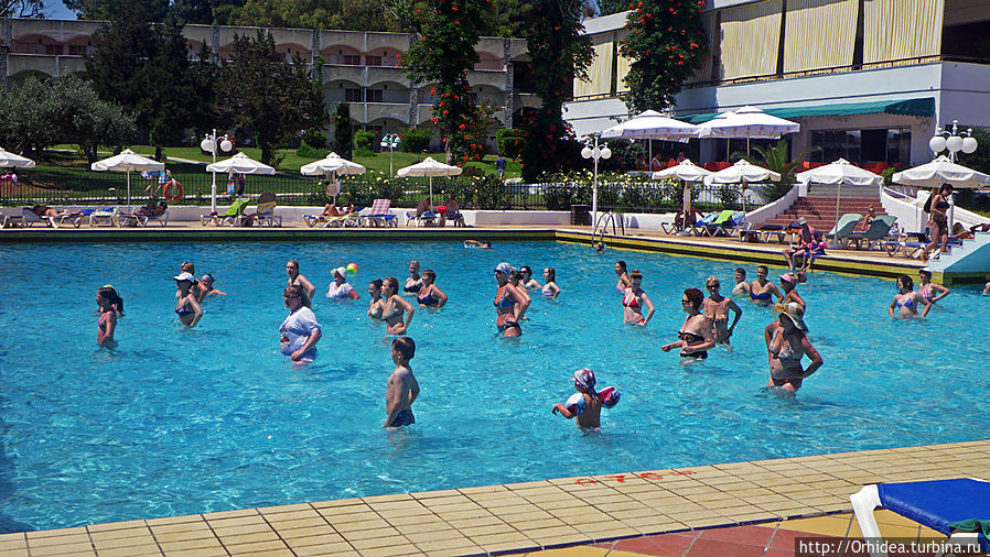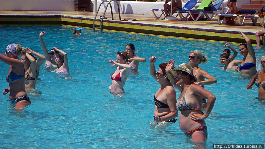 По распорядку отеля аниматор вела аквааэробику два раза в день — в 12 в бассейне и в 17 в море. Этот была молоденькая симпатичная гречанка, видимо привыкшая вести свои занятия на английском. Но в нашем случае ей пришлось быстро осваивать русский, хотя даже счет до восьми ей давался с трудом. Но что поделать, публика была настроена воспринимать только родной понятный язык, а русскоязычных было подавляющее большенство:))