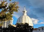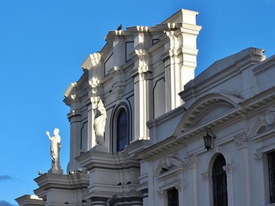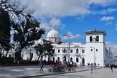 Площадь-парк Калдас. Но сейчас мы можем познакомиться только с третьим его изданием, или скорее со вторым переизданием второго издания, строительство которого закончено в 1906-м году. Первая церковь была откровенной времянкой и простояла только несколько десятилетий 16-го века. А вторая продержалась уже целых 190 лет: ее начали строить в 1594-м, а разобрали для полной перестройки в 1785-м. Но толку от нее было мало: землетрясения несколько раз повреждали недостроенную конструкцию, а когда ее все-таки довели до ума, то в ней обнаружились хронические трещины и протеки, и потому пришлось начинать этот проект заново, без особых изменений внешнего облика. Церковь аккуратно разобрали, фундамент сместили к центральной оси площади и укрепили, и в 1819-м году взялись за возведение более вечной копии. Но вскоре пертурбации периода войны за независимость заморозили этот объект, аж до 1856-го года. Когда же за него принялись снова, то хватило всего лишь полвека для создания этого шедевра.Храм занимает почти всё южную часть самой большой, но всё же не бескрайней площади центра, а поскольку она образцово засажена оргомными деревьями, то рассмотреть сразу весь фасад оттуда почти невозможно.