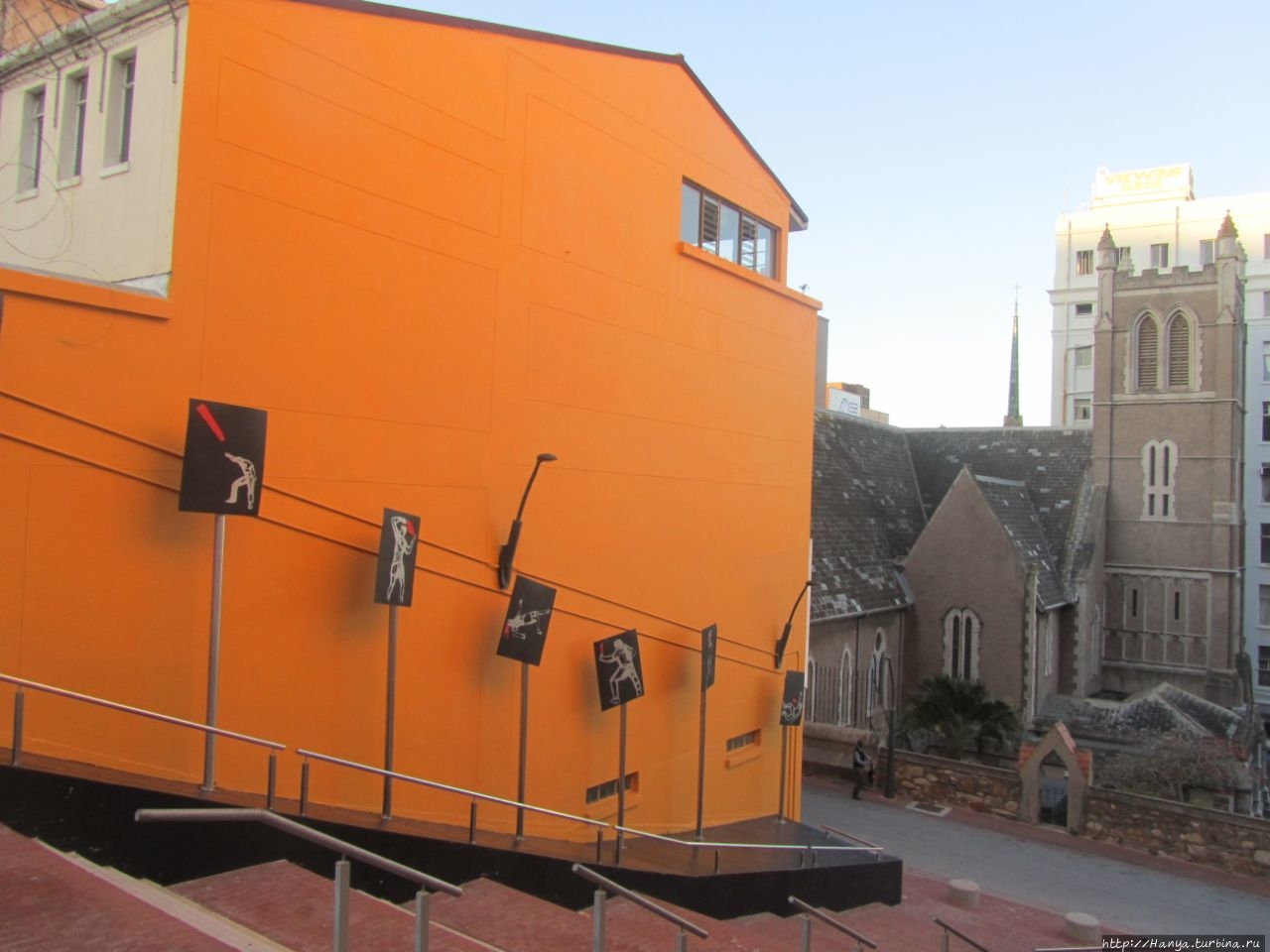 Улица, разделяющая две эти лестницы, называется Winston Ntshona Street (ранее это была Chapel Street). Часть мостовой этой улицы между лестницами называется «Chapel Street Crossing», и она составлена из разноцветной брусчатки, о которой так сказано в путеводителе к маршруту: «Это сбор людских масс, которые шли голосовать на выборах 1994 года». Что ж, иногда без подсказки бывает трудно разобраться, и то, что автору Mthetheleli Williams кажется очевидным, может быть не сильно понятным неподготовленным посетителям...