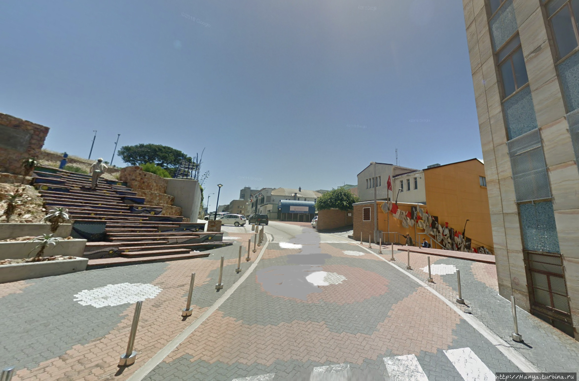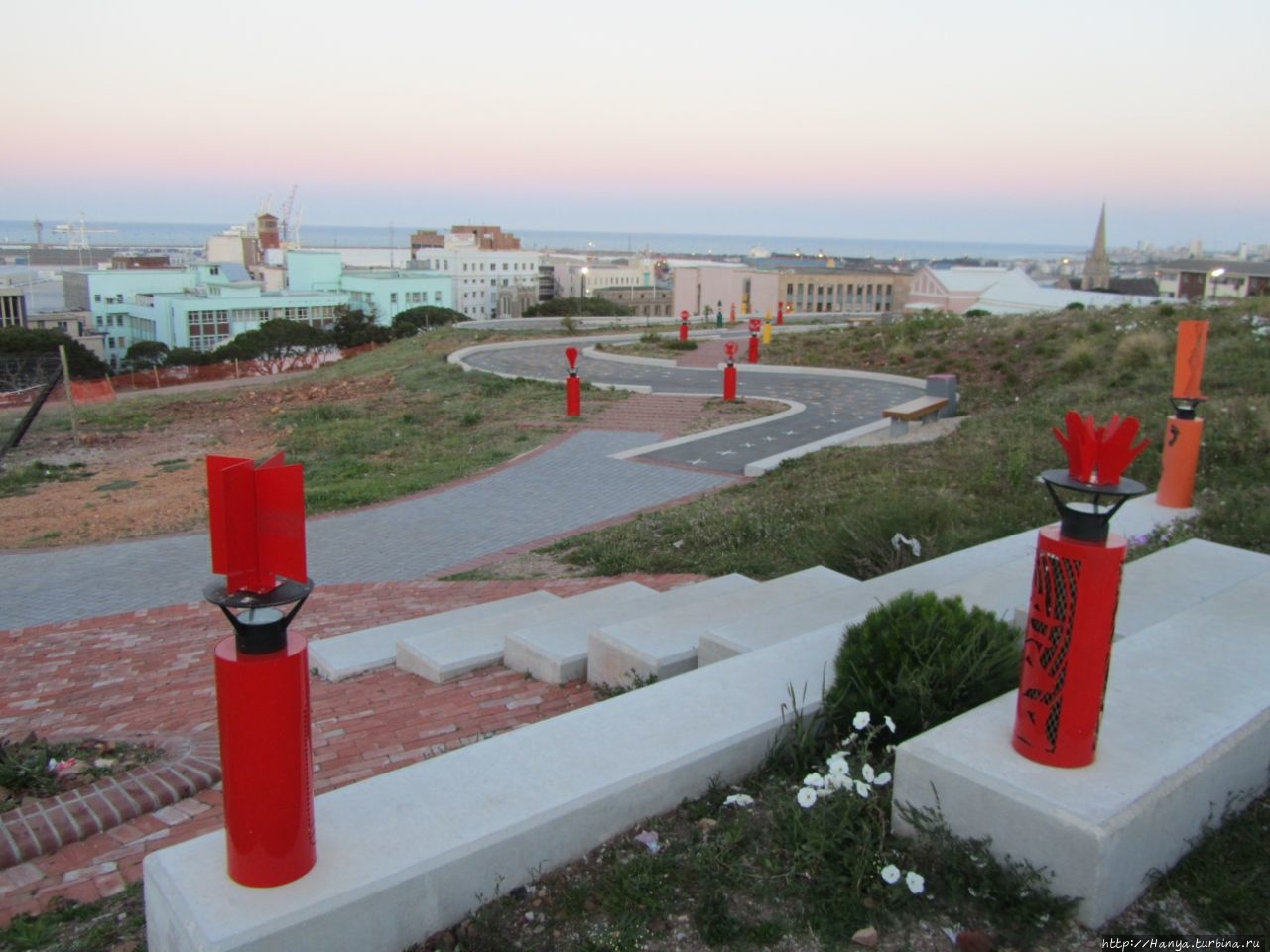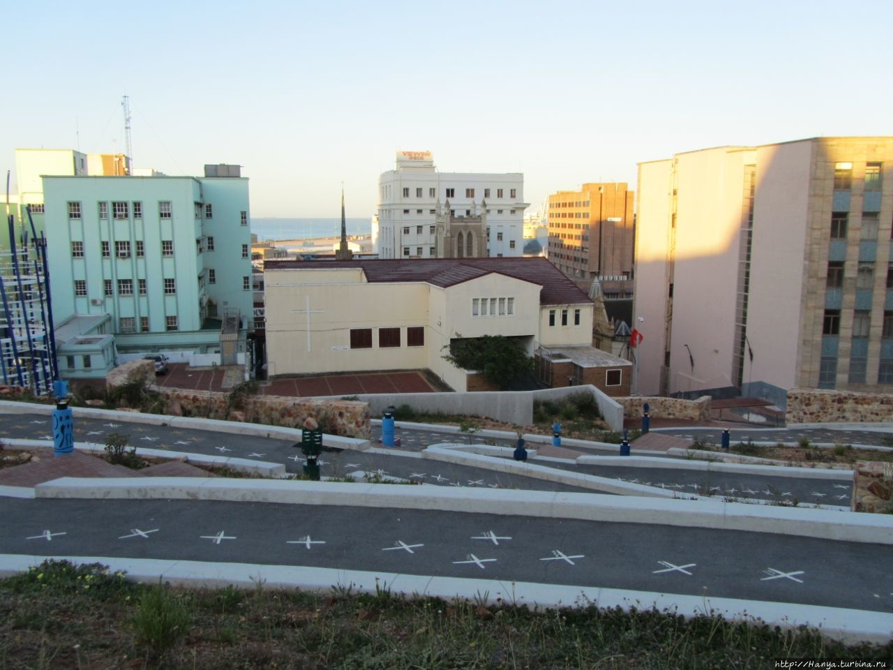 От террасы Святой Марии снизу, из центра города, здесь продолжается маршрут 67, ведущий к месту, где «гордо реет» Большой флаг страны, второй по величине в Южной Африке. И туда, на верх холма, ведет живописная лестница, ступени которой являются смесью «ярких цветов, искусства и наследия». Причем подняться наверх можно еще и по другой дорожке справа, которая змеей поднимается вверх.
