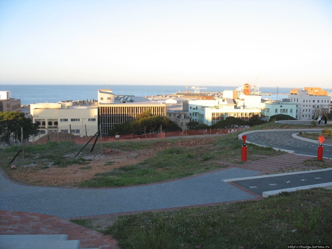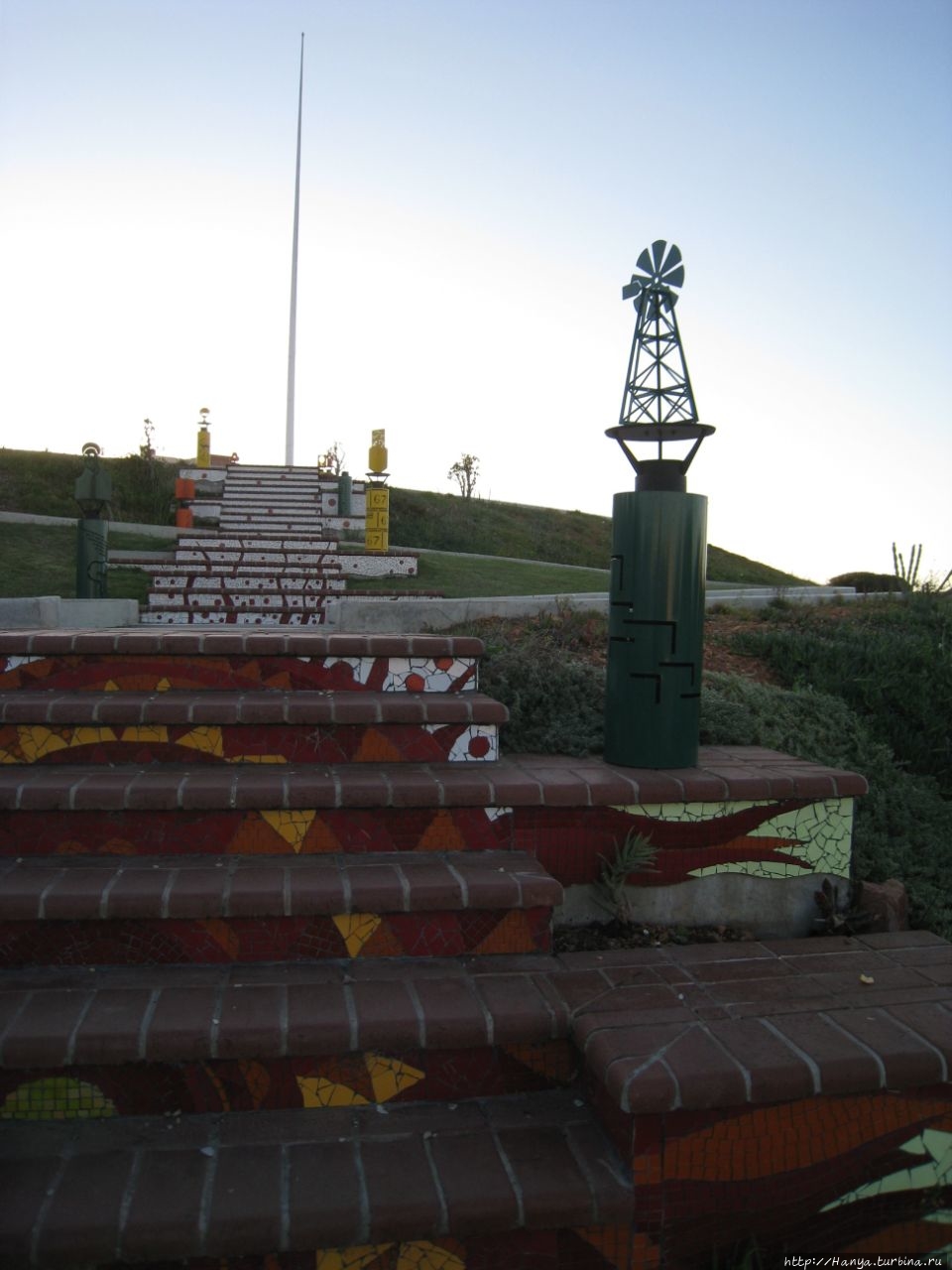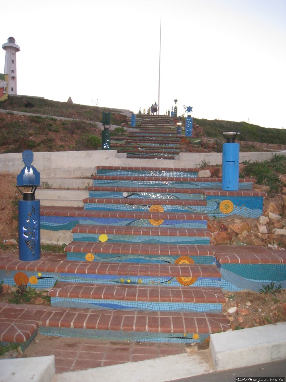 От террасы Святой Марии снизу, из центра города, здесь продолжается маршрут 67, ведущий к месту, где «гордо реет» Большой флаг страны, второй по величине в Южной Африке. И туда, на верх холма, ведет живописная лестница, ступени которой являются смесью «ярких цветов, искусства и наследия». Причем подняться наверх можно еще и по другой дорожке справа, которая змеей поднимается вверх.