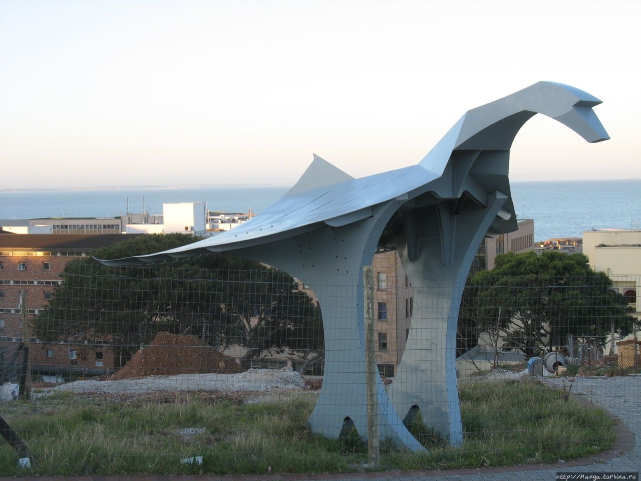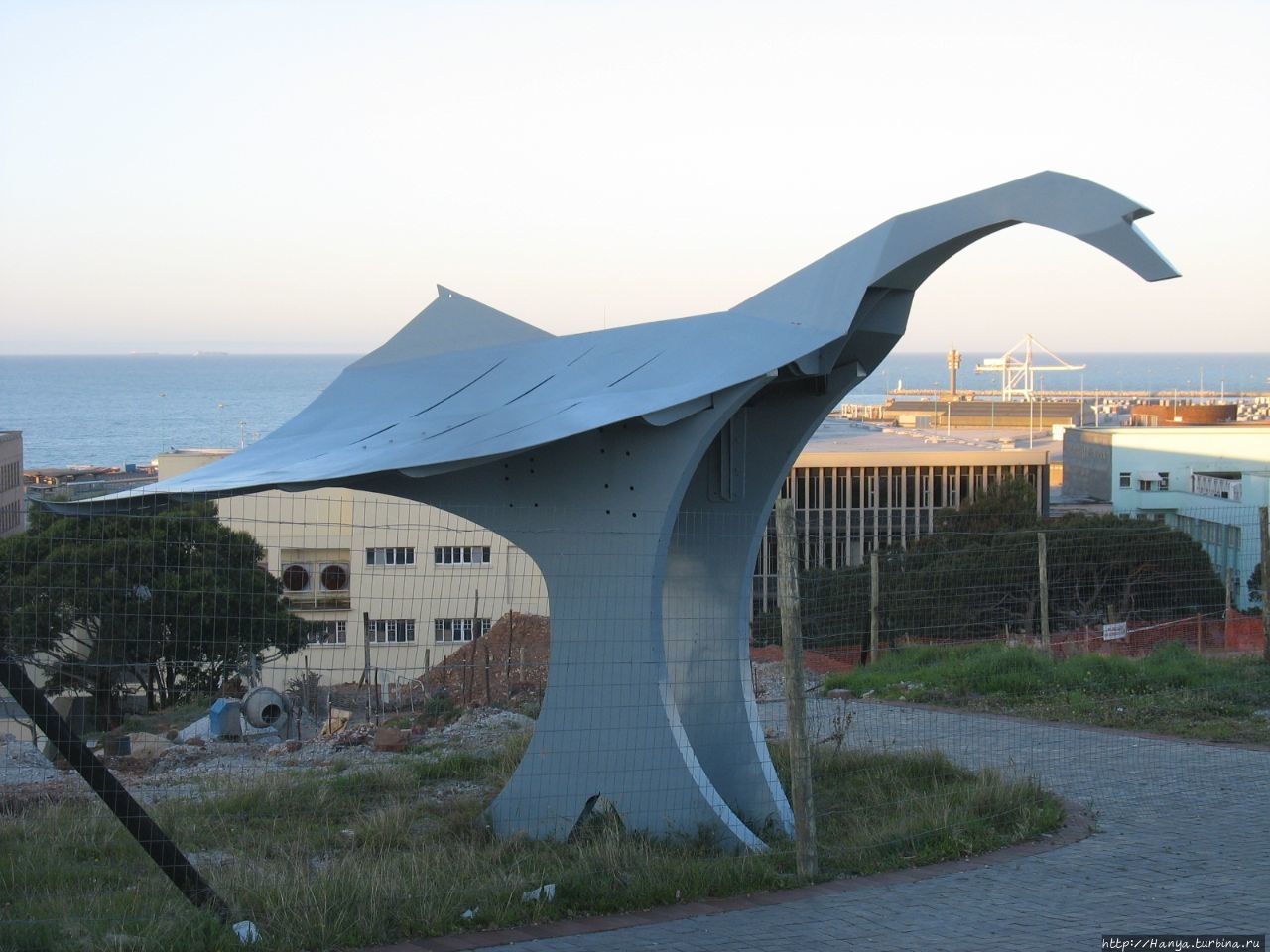 И уже не кажется удивительной одна из них, огромная, одиноко стоящая за сеткой-рабицей и готовая вот-вот взлететь. Это скульптура под названием «The Fish Bird» (высотой 3,8 метра), выполненная скульптором Mxolisi Dolla Sepeta, еще только планируется к установке на плато Заповедника Donkin Reserve. Таким образом, автор скульптуры напоминает нам, кто был хозяином холма до организации там Донкин Резерв. Однако форма птицы выглядит как НЛО, который приземлился здесь, и вы вправе оглядеться по сторонам, уж не появятся ли где и зеленые человечки? Судя по ямам, бетономешалке и забору, обустройство площади еще не завершено, но уже хорошо то, что мы увидели очень многое сегодня.
