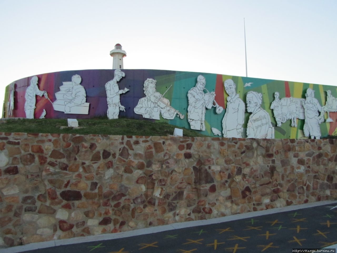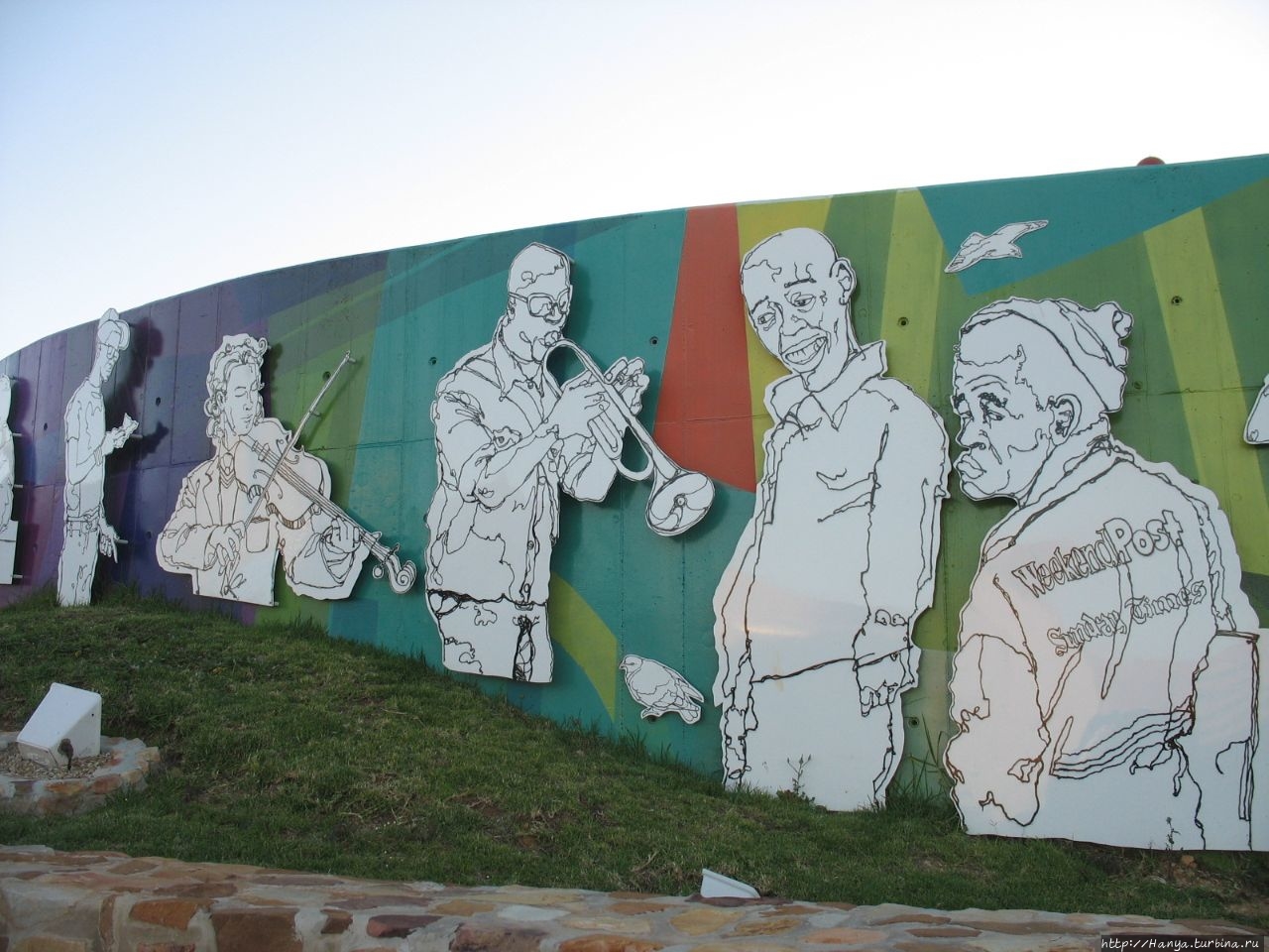 Donkin Reserve. Пирамида, маяк и история их создания. Ч.59), эти дороги были первоначально пробитыми тропами среди крутых скал. Так было и с Whites Road. Оригинальные крутые откосы с обеих сторон исключали строительство зданий, кроме Оперного театра. А сегодня здесь, напротив здания Опера-хаус, на скальной стене, размещена еще одна инсталляция – «Whites Road Wall». Задумка и исполнение было коллективным и среди авторов называют Mark Wilby в содружестве с Bongani Njalo, Bamanye Ngxale, Jason Olivier, Gabriel Chaponda, Siya Mboniswa.