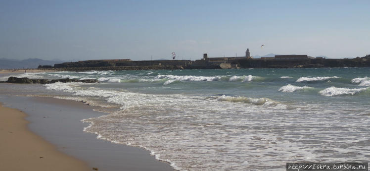Тарифа — небольшой городок, огромное количество кайтеров, прекрасный песок и очень сильный ветер. Крепость на снимке — географически совпадает с Punta de Tarifa, чтобы добраться до нее нужно пройти по дороге, соединяющей островок, на котором она расположена и материковую часть.