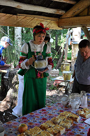 А дальше нас ожидал приятный сюрприз — сотрудники дома культуры с.Белое приготовили для нас чай. Да с пирогами вкуснющими — такие только на севере нашей области делают. Сколько ни съешь, ещё хочется!!! Правда, и постараться пришлось: вопросики про чай да всё с ним связанное так и сыпались. Мы в грязь лицом не ударили — связку бубликов выиграли, банку варенья клубничного, да конфет — шоколадных! — в достаточном количестве. А чай-то какой был — крепкий, ароматный. Из самовара, да на водичке из источника. Так что приятное с приятным и полезное с полезным совместили по полной программе.