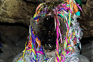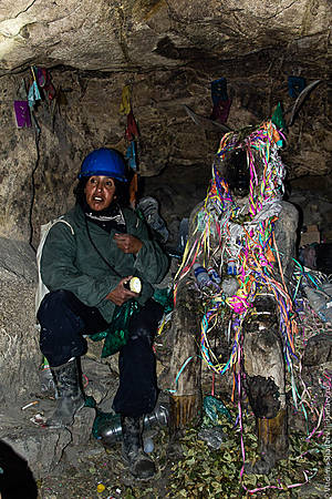 В одном закоулке присаживаемся. Мы находимся у изваяния "дяди подземелья" — местного божества. Выглядит он как черт, но ему поклоняются все шахтеры. Наверху они католики, ходят в собор и верят в Бога, а под землей свои законы и здесь главный Эль-Тио. И мать земля. В жертву приносят сигареты, листья коки и 96% алкоголь. Полагается здесь выпить его чистым, а потом, в забое, можно и газировкой разбавить.