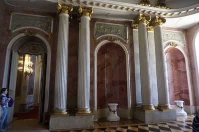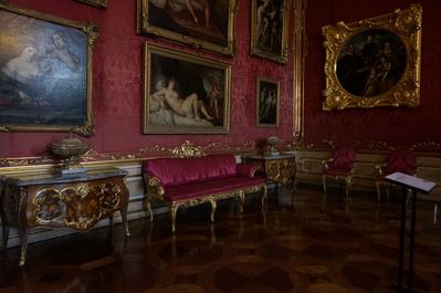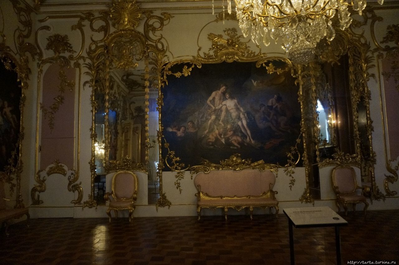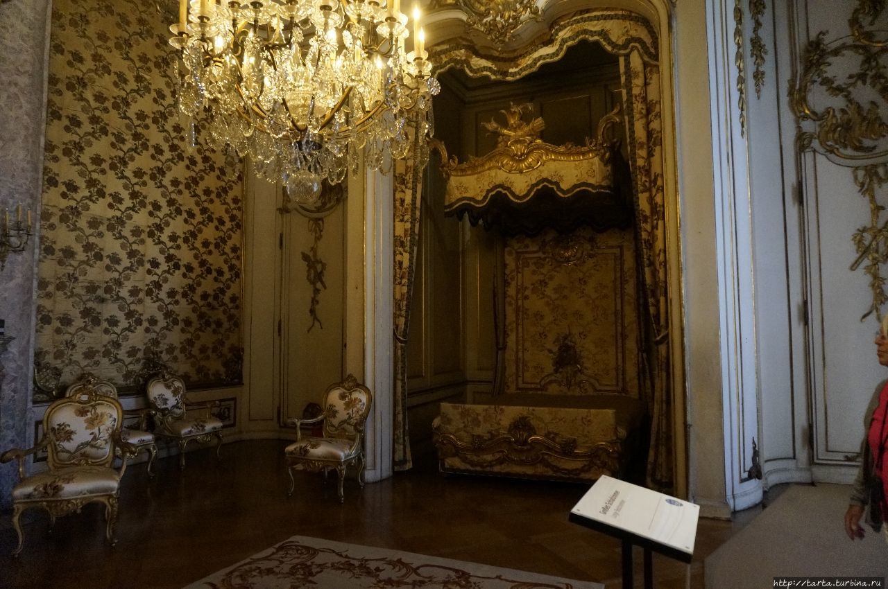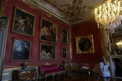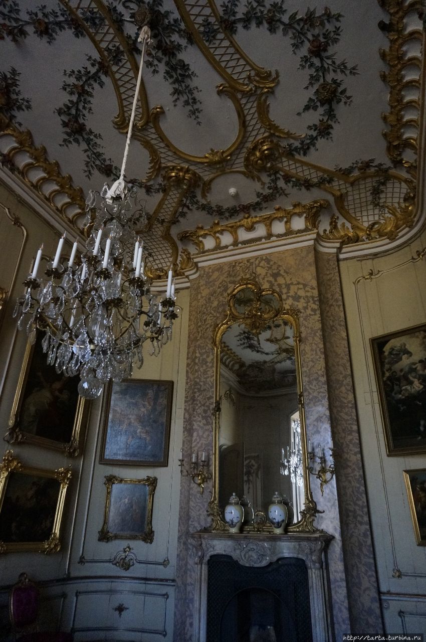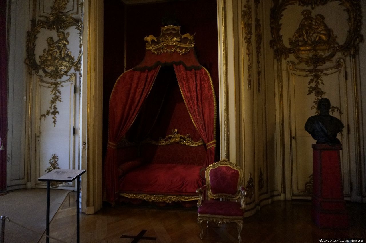 далее разделен на апартаменты с входами по отдельным лестницам и небольшие кабинеты. В пышно обставленных залах с мраморными полами, каминами, зеркалами ценная мебель, отделанная позолоченной бронзой, мозаикой, их украшают полотна итальянских и голландских художников XVI-XVIII столетий, бюсты, скульптуры, предметы декора.
