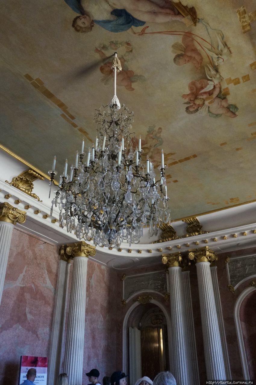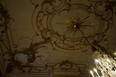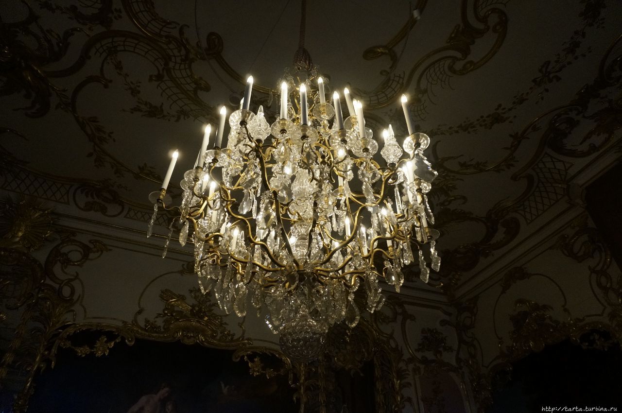 Потолки, которые сами можно рассматривать как произведения искусства, украшают хрустальные люстры.