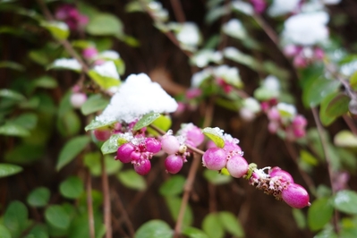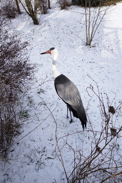 А вот за вольерами показалась просторная площадка с прудиком, и здесь, словно яблоки на снегу — яркие и нежные на вид фламинго.