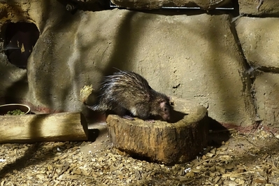 Птица имеет грандиозную выдержку, может очень длительное время не менять позу. Это позволяет сделать хорошие снимки (не в моем случае, стекло все-таки бликует), но наблюдать за неподвижной фигурой не так интересно, и мы идем дальше. Здесь завтракает дикообраз. Вот он уморительно трескал яблоки.