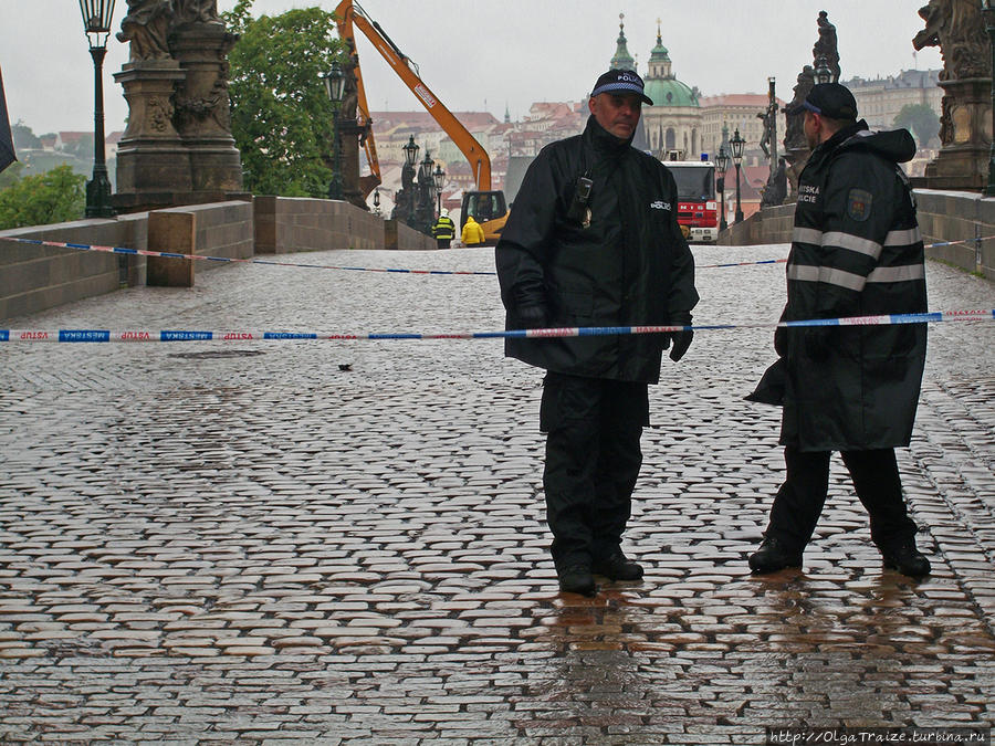 3 июня перекрыли Карлов мост. На нем стоял маленький экскаватор, который своим ковшом должен был убирать или отгонять деревья от опор моста, чтобы он не пострадал