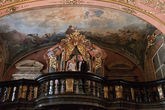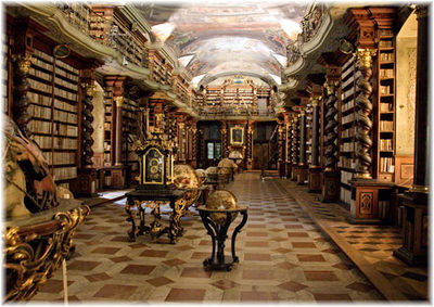 Если кто-то захочет показать своему гостю нечто невиданное, его ведут в Клементинум. И в первую очередь – в Университетскую Библиотеку. Здесь поражает запредельность того, что было создано во времена барокко, причем в диапазоне всего, отпущенного этому стилю времени. И главное – здесь нет ничего новодельного, реконструированного. Созданная в 1722 году, она отражает устройство европейских библиотек того времени. Тогда глобусы, астрономические приборы и книги служили не только научным целям, они были предметом гордости их владельцев и являлись , по сути, музейными экспонатами. Их можно было трогать руками, они служили предметом для «ученых» бесед. Вспомним разговор барона Мюнхгаузена со священником из культового фильма.