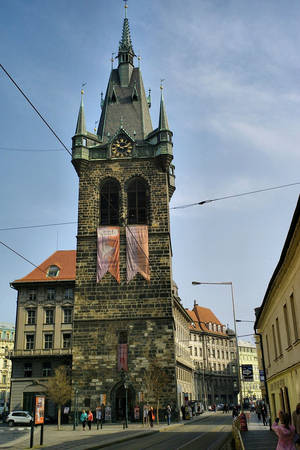 Проходим ещё совсем немного и первая встреча с глубоким средневековьем: Йиндржишская башня. Башня (Jindřišská věž) была построена в готическом стиле между 1472-1476 годами, имела деревянную крышу и поначалу служила только колокольней. Но в 1577 году на башне установили часы, циферблат которых украшен довольно колоритными персонажами. Йиндржишская башня является отдельным строением и находится неподалеку от костела святых Йиндржиха и Кунхута, колокольней которого она служила изначально. Но со временем её перестали использовать для церковных нужд и сейчас в Йиндржишской башне находится несколько ресторанов и кафе, а также галерея искусств и музей.
