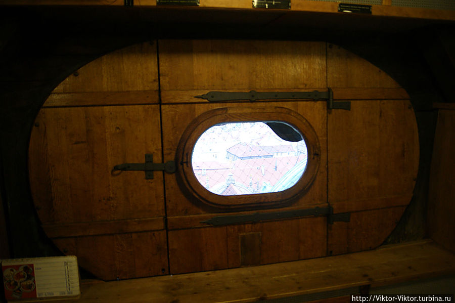 Окошки расположены на каждой стороне башни и на них подписано, какое посольство из этого окошка видно.