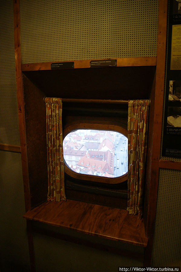 Для этого на самом верху башни с 1949 года был оборудован круглосуточный наблюдательный пункт службы Государственной безопасности Чехословакии (Státní bezpečnost или StB). Небольшое помещение под куполом на высоте 70 метров имеет 4 зарешеченных окошка,