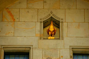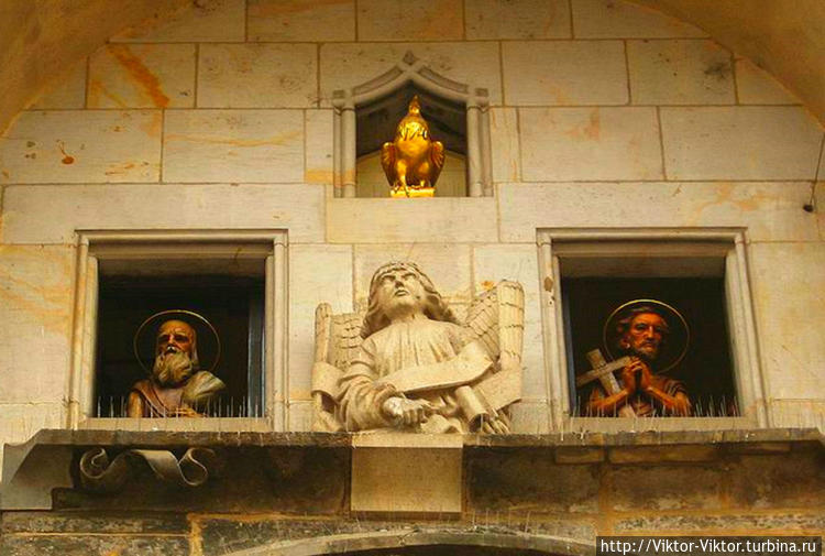 Под петухом находится Ангел — лучшая из возможных защит. Считается, что это самая первая статуя на часах.