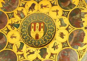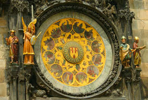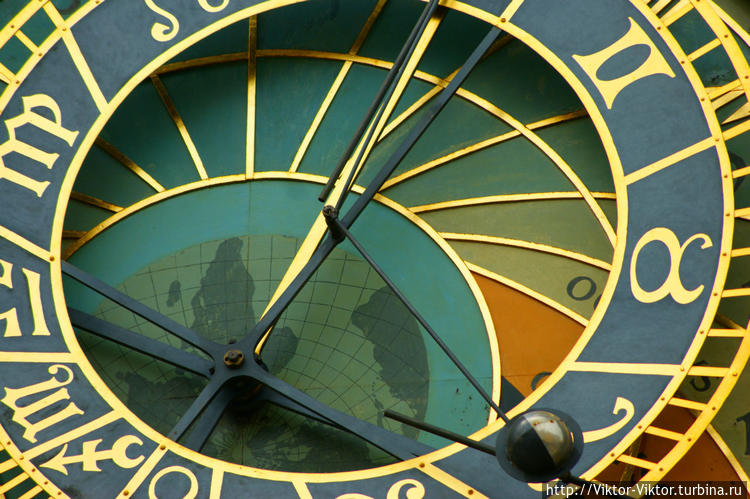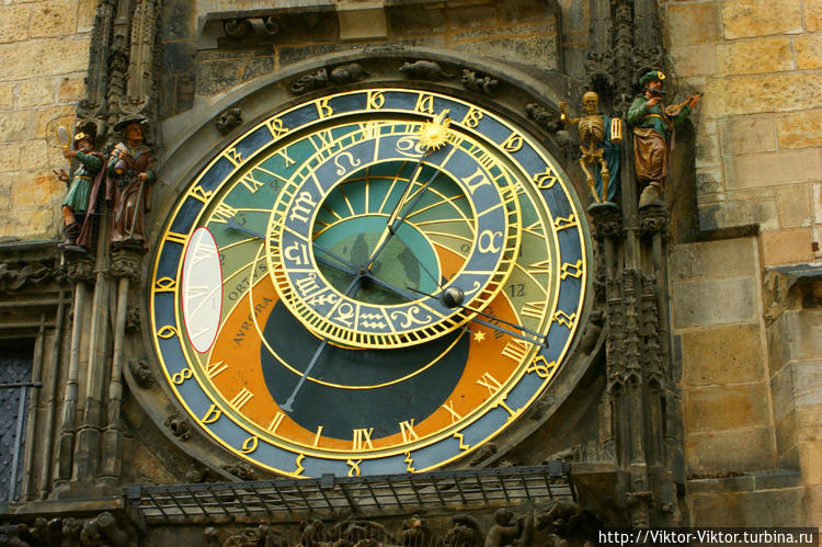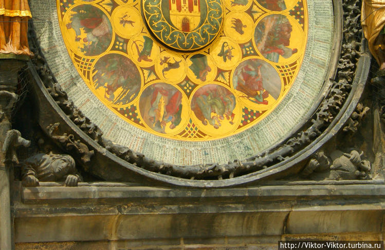 В центре внутреннего позолоченного диска изображен герб Праги, окруженный 12 знаками созвездий Зодиака.