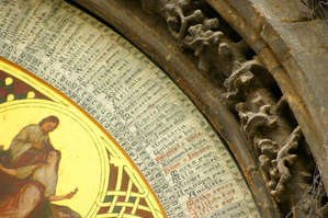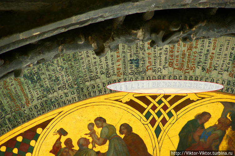 На внешнем краю циферблата-календаря написан первый слог имени святого, праздник которого отмечается в этот день, или слог для обозначения не праздничного дня. Это так называемый «цисиоян» — стихотворный слоговой календарь, который использовался в Чехии с XIII по XVII века, и служивший для лучшего запоминания событий христианской церкви.