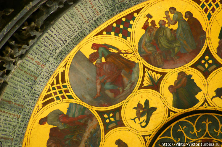 По краю позолоченного диска расположен календарный цикл картин на тему чешской сельской жизни в средневековье. Картины, символизирующие 12 месяцев, изображают: