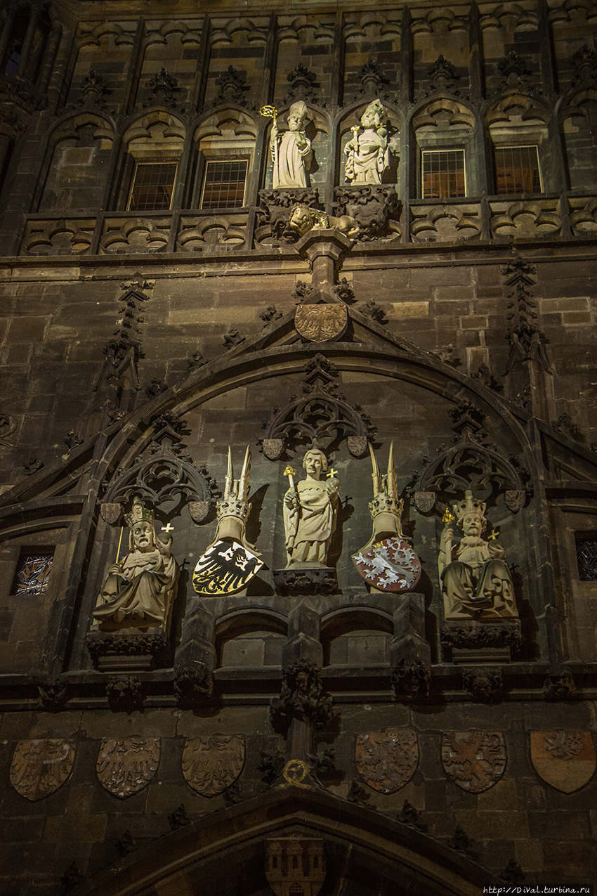Парлерж богато украсил восточный фасад моста, изобразив на суровой глади стены над аркой – гербы 10 чешских регионов, над гербами — фигуры самого заказчика Карла IV, Св. Вита и Вацлава IV, выше – два чешских покровителя Войтех и Сигизмунд :