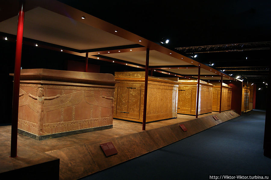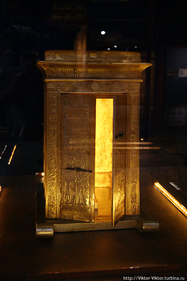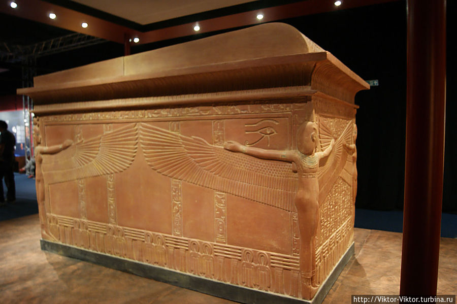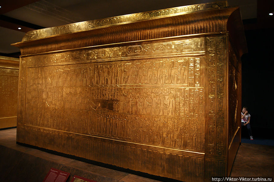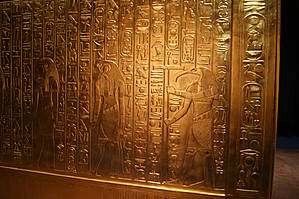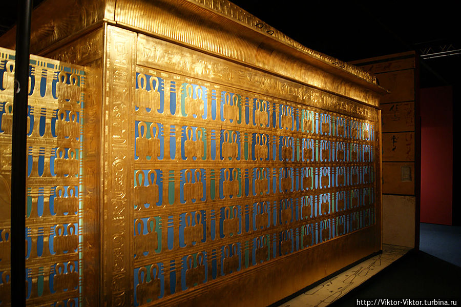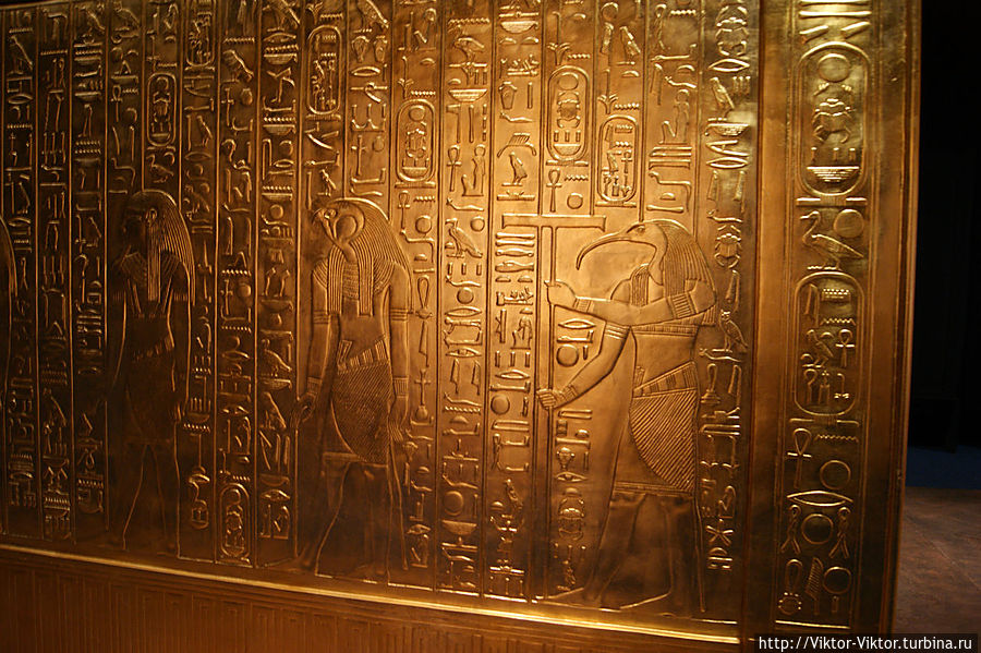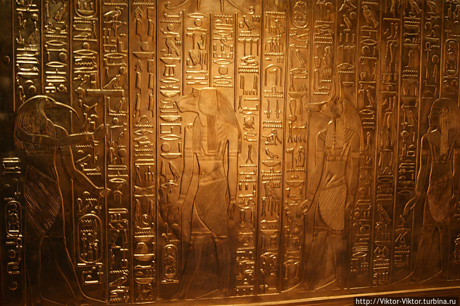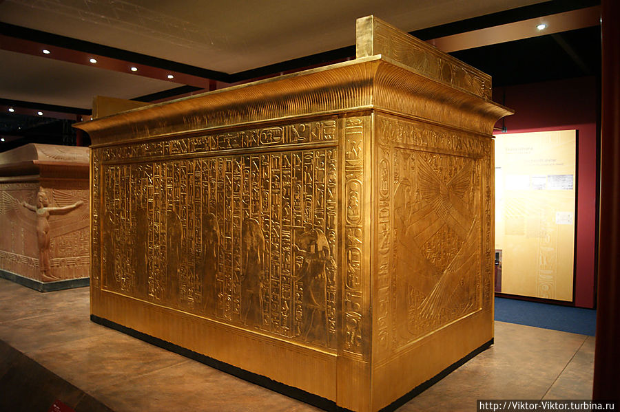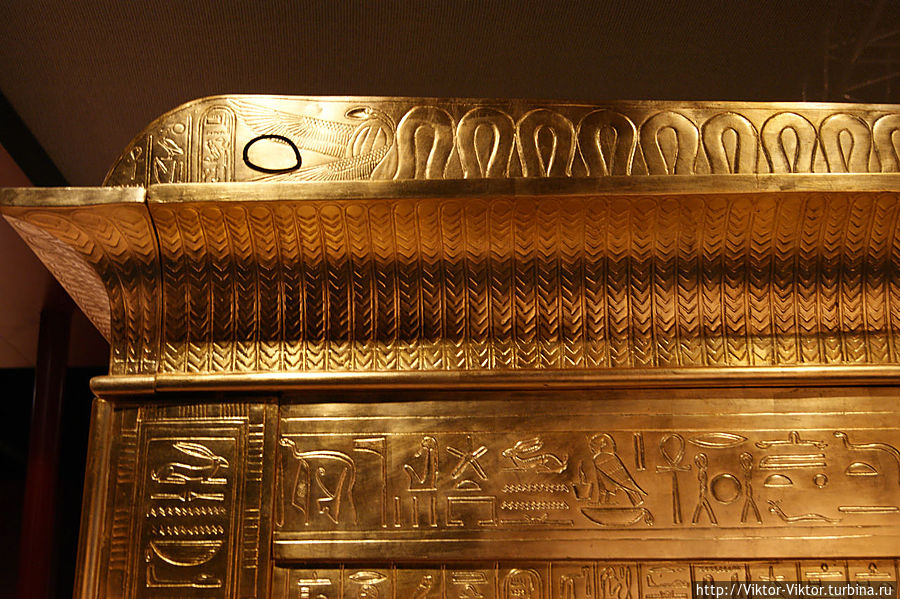 Внутри этого саркофага имелась золоченая деревянная рама, покрытая льняным полотном. Она служила футляром для трех других тяжелых деревянных саркофагов, покрытых золотом и испещренных многочисленными надписями.