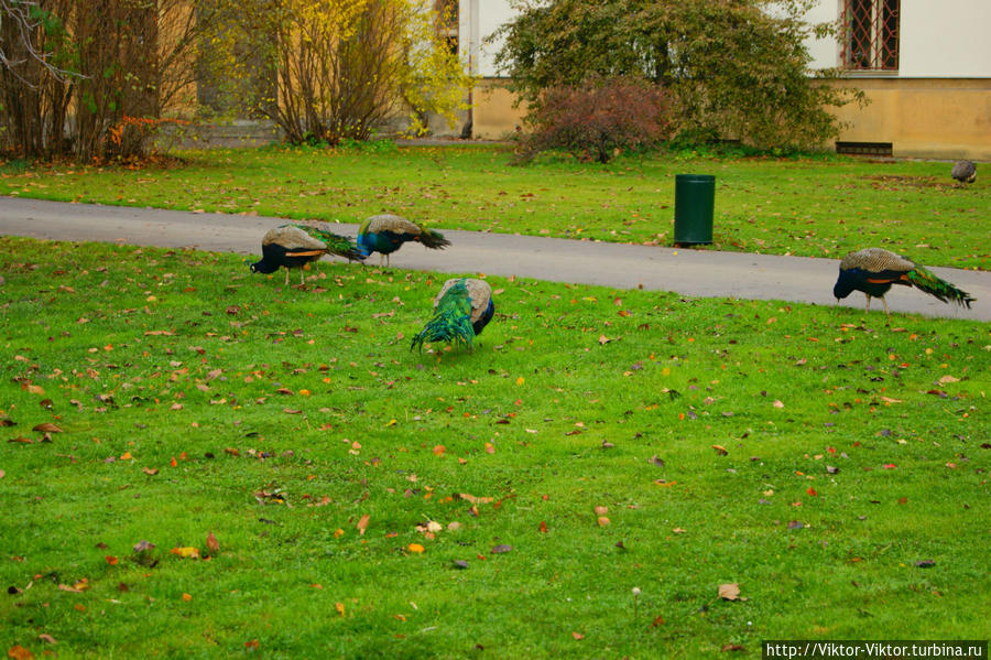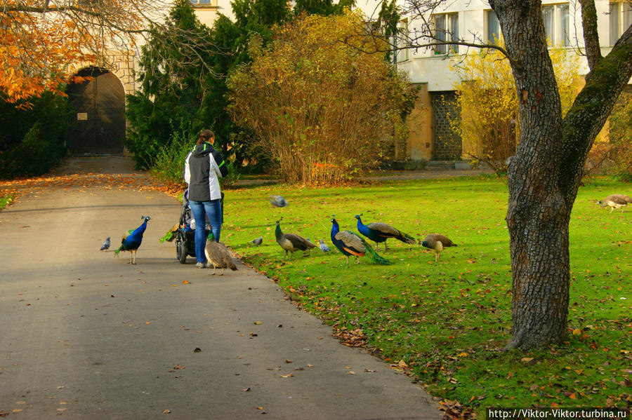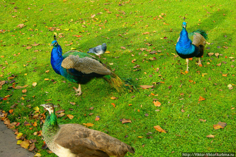 Парк в английском стиле примечателен свободно прогуливающимися в нем павлинами,