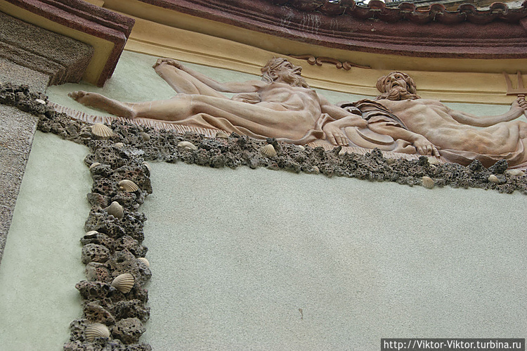 и в самой высокой своей части завершается аркой, украшенной рельефами водных богов, русалок, тритонов и морскими раковинами.