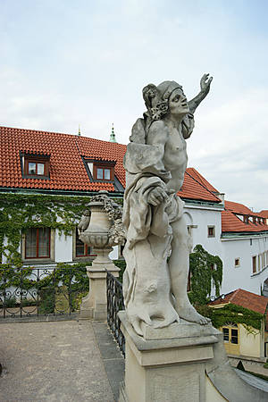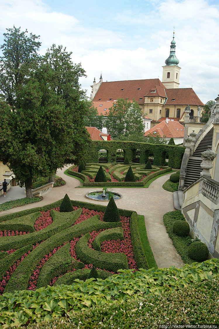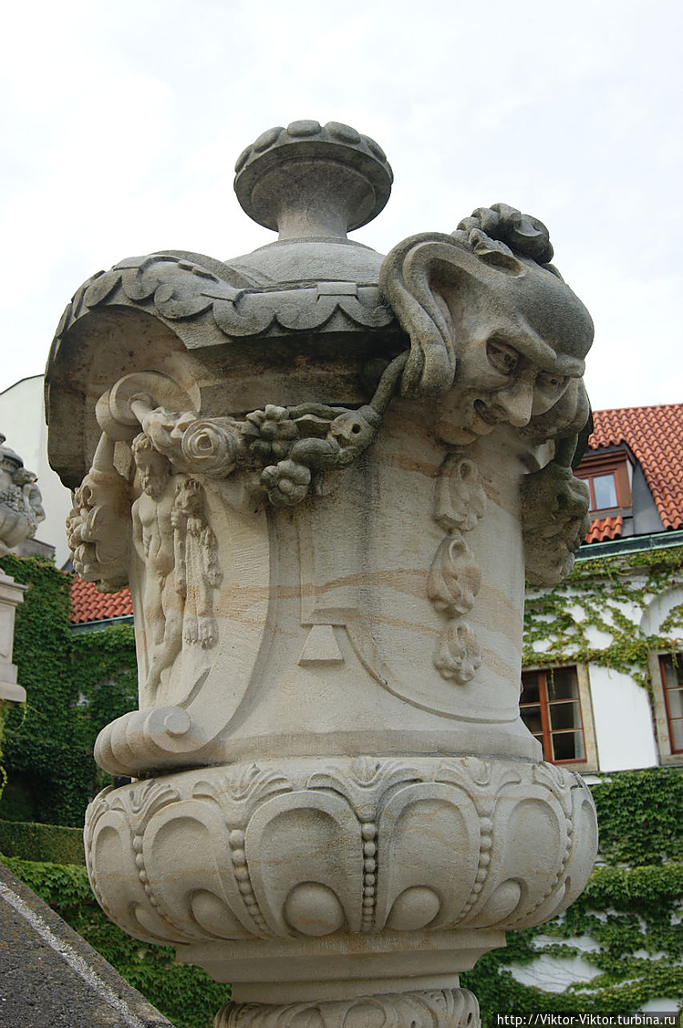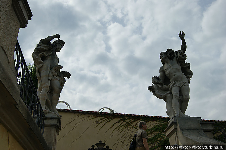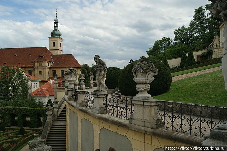 Склон Вртбовского сада, по задумке архитектора, был прорезан диагональной осью, на которую нанизали три террасы в разных уровнях, соединенные лестницами.
