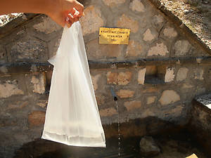 Но это еще не все! Я заприметила пологий склон и на следующий день решила полезть и взять эту упрямую вершину. Но сначала надо было запастись водой. Пошла к источнику, но забыла бутылку. Возвращаться было далеко, придумала набрать воду в пакет. Завернула дважды, прикрепила внутри рюкзака вместо системы.
