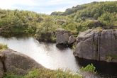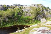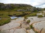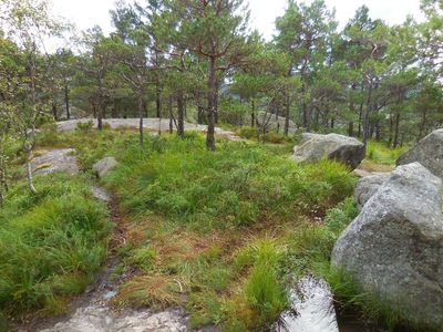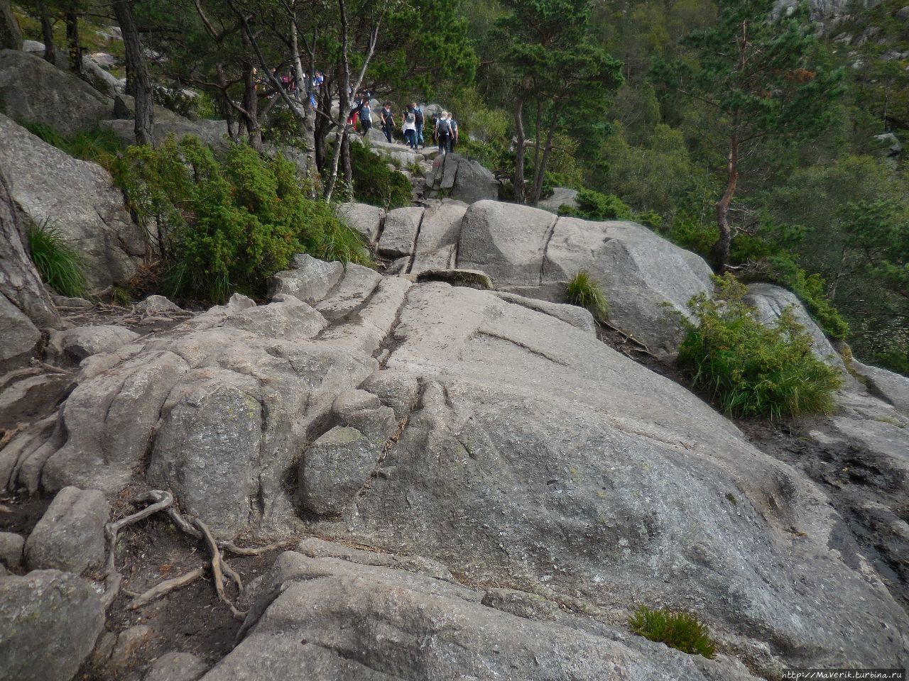 Чтобы руки были свободными пришлось всю фототехнику убрать в рюкзак. При подъёме, то и дело приходиться придерживаться руками за камни, чтобы не упасть. Очень забавно было смотреть на местных норвежцев, как они ловко поднимались, да и ещё некоторые из них совершали подъём с собаками. Для тех кто утомился предусмотрены места для отдыха — скамейки со столиками. Вот наконец мы вышли на заболоченную плоскую площадку с деревянным настилом.