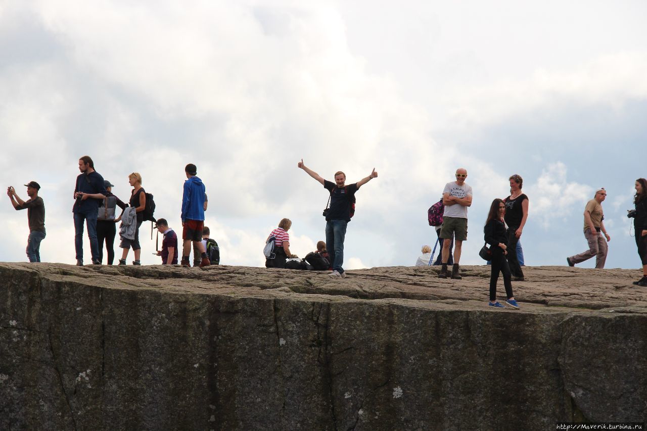 Итак, преодолев 3,8 километра за 2 часа мы оказались на Кафедре! Всех туристов объединяет одно — сделать удачную фотографию на память об этом восхождении с прекрасной панорамой Люсе-фьорда.