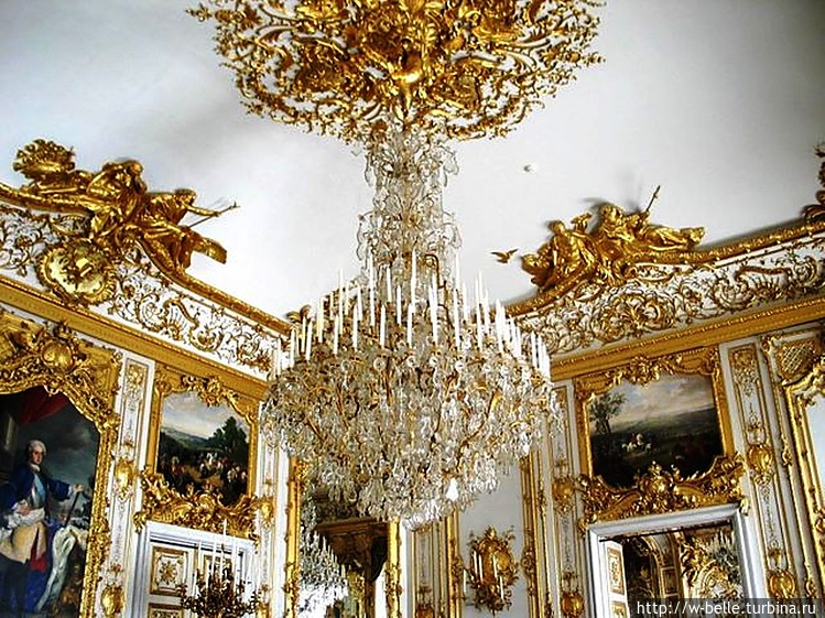 Поэтому следующий Зал совещаний с его бело-золотой гаммой и обилием воздуха словно возвращает нас на землю и дает некоторую передышку перед следующим потрясением, ждущим нас впереди. В этом помещении очень мало мебели — маленькие банкетки вдоль стен, золотые напольные канделябры, уникальные часы 18 века в углу, а в центре стол короля и его кресло-трон, — благодаря чему взгляд сразу останавливается на главном: точной копии, выполненной Жулем Жури, парадного портрета Людовика 14 кисти Гиацинта Риго.