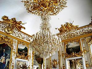Согласно придворному этикету времен Людовика 14, король давал аудиенции в своей спальне. Зал, в который мы входим сейчас, — это Парадная спальня. но не Людвига 2, хозяина Херренкимзее. Лучшее помещение своего замка он "отдал" Людовику 14.Людвиг никогда не спал здесь. Кстати, спальня Херренкимзее не является копией Парадной спальни в версале, как можно было подумать. Это мемориал, дань уважения и преклонения перед идеалом; копирование чужих идей здесь было бы оскорбительным и неуместным. В Парадной спальне действительно захватывает дух, и начинаешь ощущать свою ничтожность перед недосягаемым величием королевской власти.