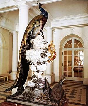 И вот прямо из парка мы входим в Вестибюль. Здесь нас встречает скульптура величественного павлина со спущенным вниз роскошным длинным хвостом, выполненного из цветной эмали и позолоченной бронзы и сидящего на увитой плющом мраморной вазе, стоящей в свою очередь на цоколе из красного мрамора. Павлин — это олицетворение монаршей власти и солнца. Данная скульптурная группа — своеобразная увертюра к последующим залам замка, посвященным Королю-Солнце.