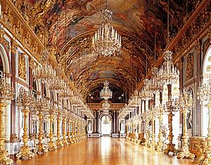 А теперь обещанное потрясение. Мы входим в Большую зеркальную галерею — знаменитый зал как Версаля, так и Херренкимзее. Она занимает почти всю западную часть замка и граничит с двух сторон с Залом войны и с Залом Мира. С одной стороны, Большая зеркальная галерея, несомненно, является копией версальской Зеркальной галереи, но с другой — превосходит ее, прежде всего по размерам: по своей длине (98 м) она протяженнее версальского оригинала (73 м) на 25 метров! При этом ширина галереи составляет 11 метров, а высота — 13 метров. Большая зеркальная галерея была построена в 1879-1881 годах по проекту Георга фон Доллмана. По внешней стороне расположены 27 окон, выходящих в парк.