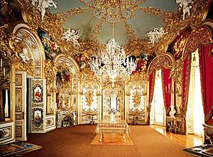 Мы проходим далее, в Голубой салон. Эта комната оставляет ощущение чего-то нереального, сказочного, благодаря декоративной лепной отделке стен и потолка в виде переплетающихся фантастических лиан, заодно обвивающих и большие зеркала. Здесь особенно впечатляет камин. Кажется, что он целиком сделан из хрупкого фарфора; на самом деле фарфоровые детали — лишь элемент отделки, с которой гармонируют два канделябра тончайшей работы, выполненные по оригинальным эскизам из мейсенского фарфора. И снова одна печальная деталь — ажурная белоснежная люстра должна была быть изготовлена из слоновой кости, но в итоге сделана всего лишь из гипса. Финансовый кризис не позволил Людвигу 2 приобрести люстру, достойную королей...