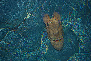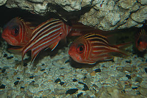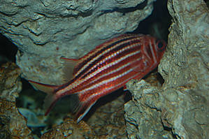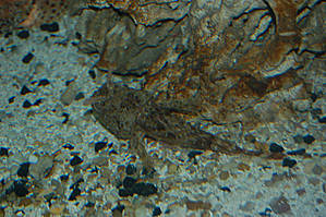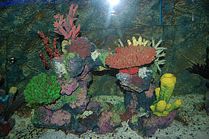 Первое, что Вы увидите при входе — это бесконечные ряды с аквариумами в обеих стенах океанариума. Посетители идут между ними в полумраке, окон и дневного света нет, есть только подсветка поверх аквариумов. В аквариумах помимо рыбок есть немножко кораллов и в паре аквариумов живут вместе с рыбами крабы.