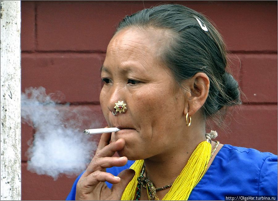 Разложив свой нехитрый скарб на автобусной остановке, они сидели небольшой группкой, попыхивая цигарками и привлекая наше внимание торчащими из носа кольцами, называемыми «пхули». Но это еще не всё, что украшало лица вовсе немолодых женщин. Их необычный вид дополняли довольно-таки массивные вставки в левую ноздрю, ходившие ходуном при весьма живом общении между собой. Особенно впечатлили две из них. Одна, поначалу настороженно смотревшая в нашу сторону, постепенно превратилась в добрую сказочную бабу Ягу. Другая – с испещренным множеством морщин лицом, сохранившим миловидные черты былой красавицы, была с тем чувством собственного достоинства, которое свойственно настоящей аристократке.
