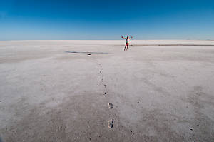 Бросаем автомобиль возле очередной харчевни и идем в полную темноту с фонариком. Глаза опять видят воду, но мы упорно шагаем вперед. Проходим 10 метров, 20 , а воды нет и под нами белая пустыня. Любопытство заставляет отколоть белый комочек и попробовать. И вот свершилось соленый вкус говорит нам о том, что мы гуляем по озеру своим собственными ногами и ноги сухие. Одна только мысль не дает покоя, как жаль , что не удастся всю эту красоту сфотографировать.
