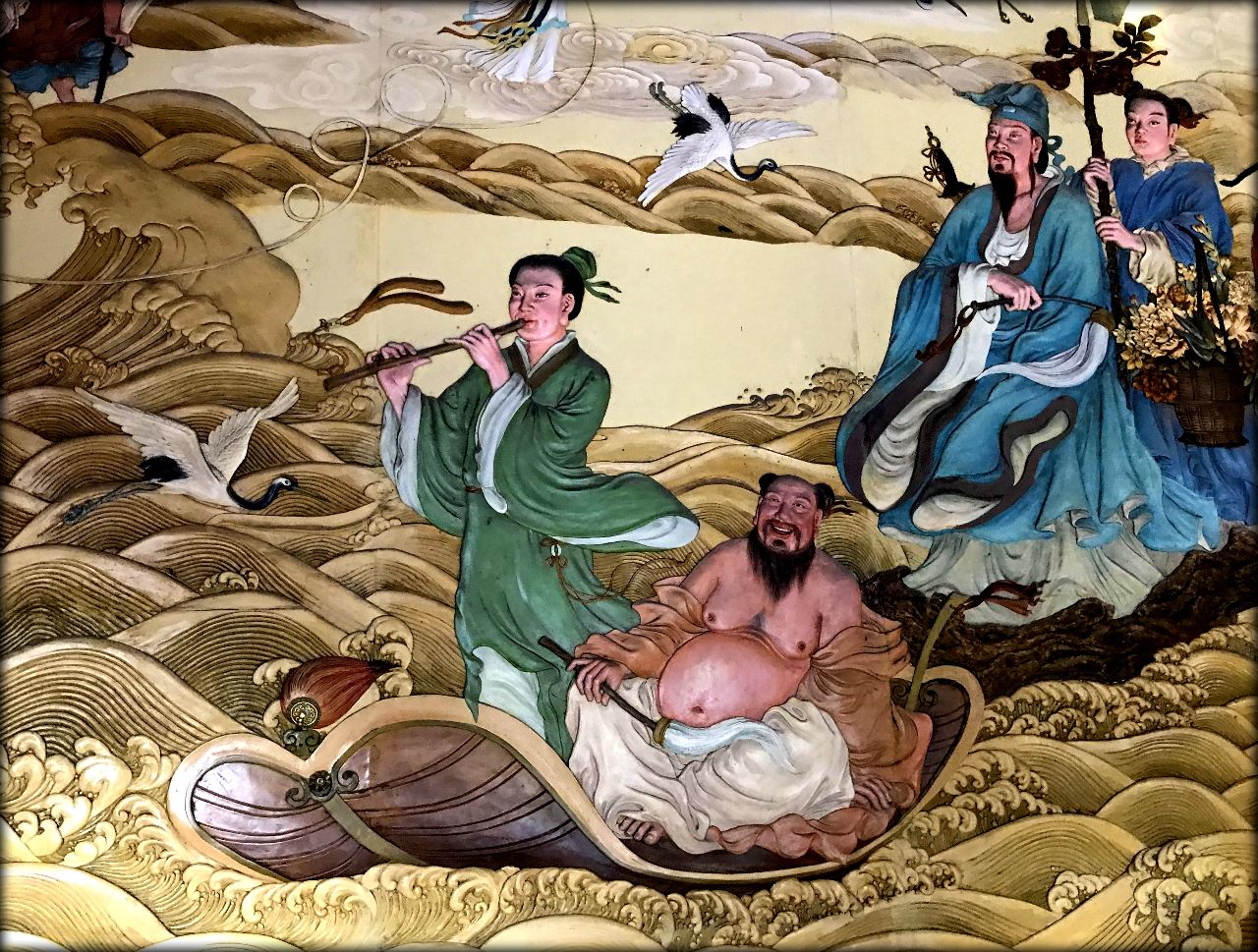 Вся прекрасная территория с множеством мостиков, храмов и скульптур посвящена переходу восьми святых через море, во время которого каждый из них явил своё чудесное искусство: один поплыл на железном посохе, другой — на веере, третий — на бумажном осле, четвёртый — в корзине с цветами, а кто-то воспользовался бамбуковой ручкой от веера, деревянными кастаньетами, плоской бамбуковой корзиной, а самый изобретательный встал на нефритовую пластинку, инкрустированную чудесными камнями, излучающими свет.