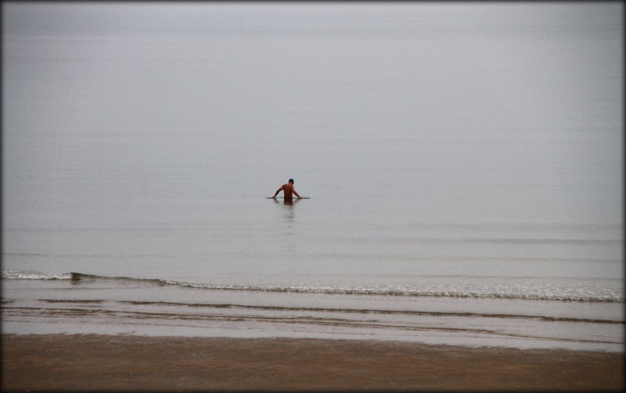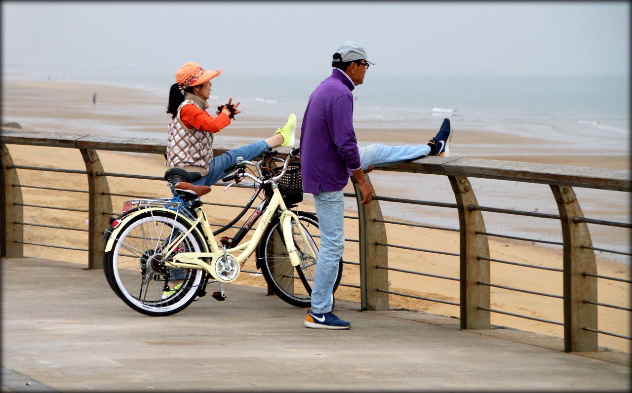 В центре города я нашёл широчайший пляж с чистым песком. Температура воды в Жёлтом море, наверное около 23-24 градусов. В воде было теплее, чем в этот пасмурный день на улице. Не вылазил минут сорок. Понравилось очень, хотя я люблю волны. Потрясающая атмосфера тишины и спокойствия.
