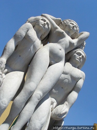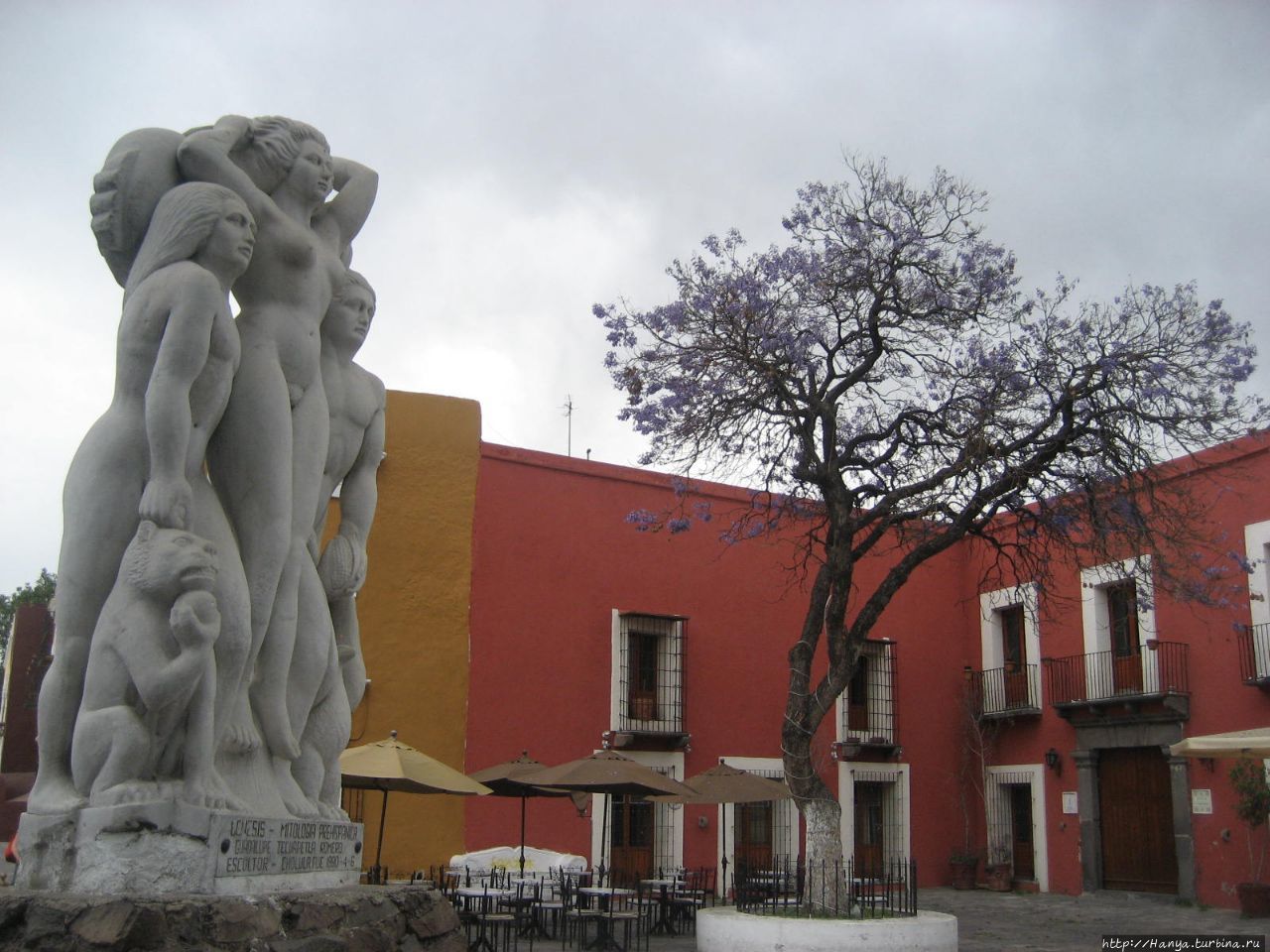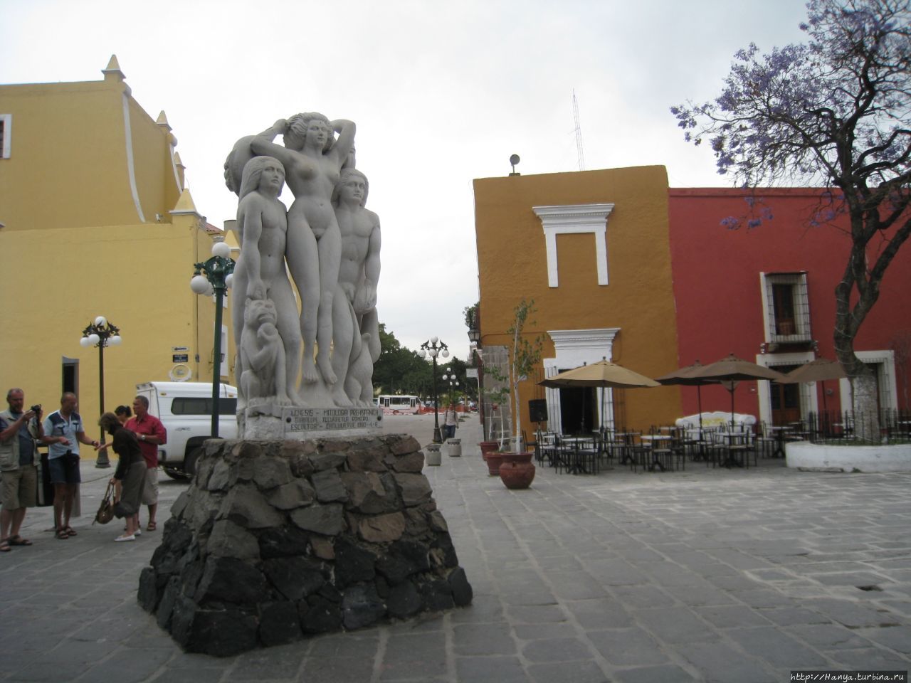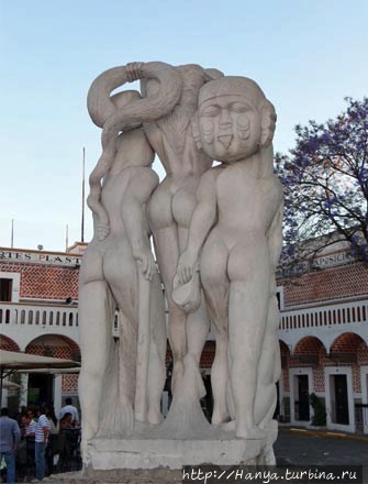 Побланский Монмартр Barrio del artista. Ч.40), мы останавливаемся рядом со скульптурной композицией под названием «Mitologia Genesis Prehispanica» (Генезис доиспанской мифологии), выполненной Guadalupe Tecuapetla Romero в 1990 году. Все фигуры сделаны нагими, в полный человеческий рост, при этом у фигуры женщины в центре круглое лицо и неподвижный взгляд. Она чуть придерживает волосы, которые распушает ветер. Однако заглянув сзади, мы видим, что она держит в руках змею, но непонятным стала какая-то маска, которая опирается на спину одного из мужчин. Женщина опирается одновременно на плечи обоих мужчин, у которых тоже очень специфичные, но квадратные лица, их взгляд также устремлен вдаль. У ног мужчин виден ягуар и орел, а справа от женской головки видна пасть змеи. Статуя выполнена из белого камня, и я бы сказала очень реалистично. Правда, совсем непонятно, почему женщина находится в центре и как бы превалирует над мужчинами. Вроде бы индейцам не был свойственен матриархат?