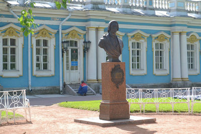 Бюст знаменитого архитектора выполнен и установлен уже в новейшеее время. Скульптор М.Т. Литовченко. Архитектор С.Л. Михайлов. Открыт 22 ноября 1991 г. Материалы: бронза — бюст, картуш; гранит красный, полированный — постамент. Высота бюста — 120 см, высота постамента — 250 см. Бюст знаменитого архитектора , выполненный в традициях парадных портретов XVIII века, установлен рядом с Екатерининским дворцом, построенным зодчим. Иконографическим материалом послужил живописный портрет Ф.Б. Растрелли, написанный французским художником П. Ротари в 1750-х гг. (статья об архитекторе, с портретом