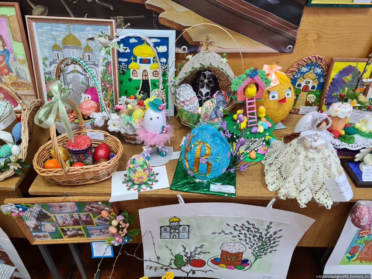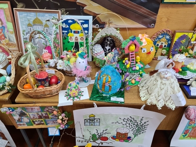 Временная выставка посвященная православной пасхе, и ее атрибуты, созданные детскими руками.