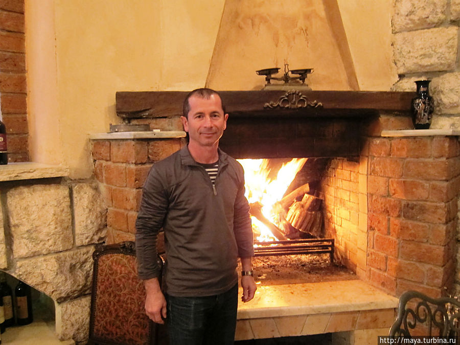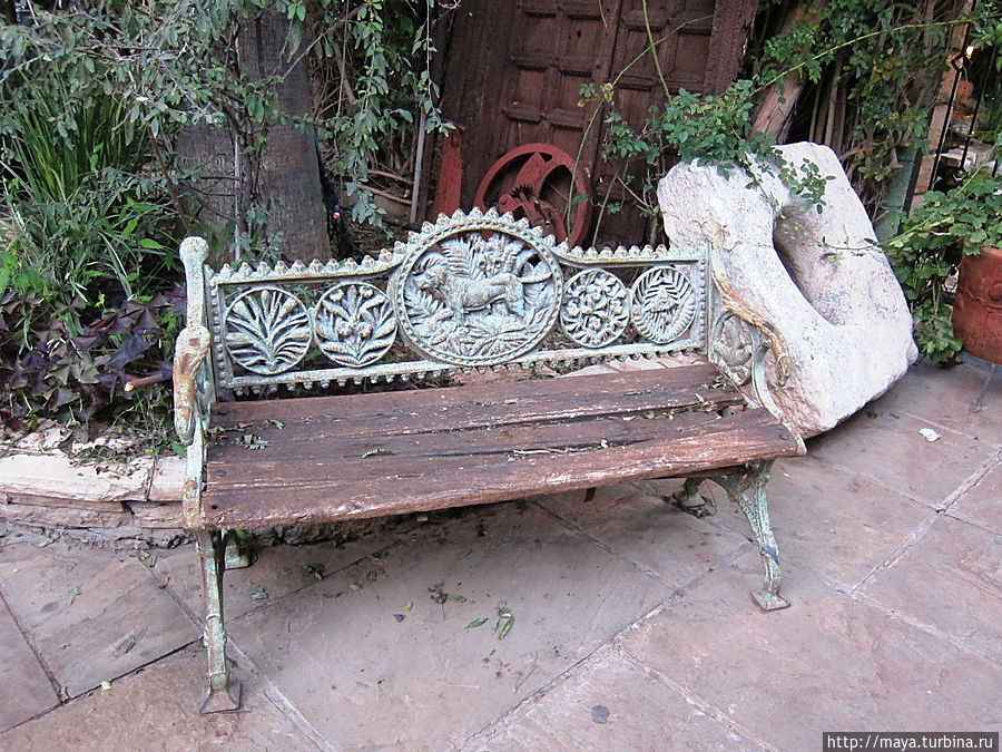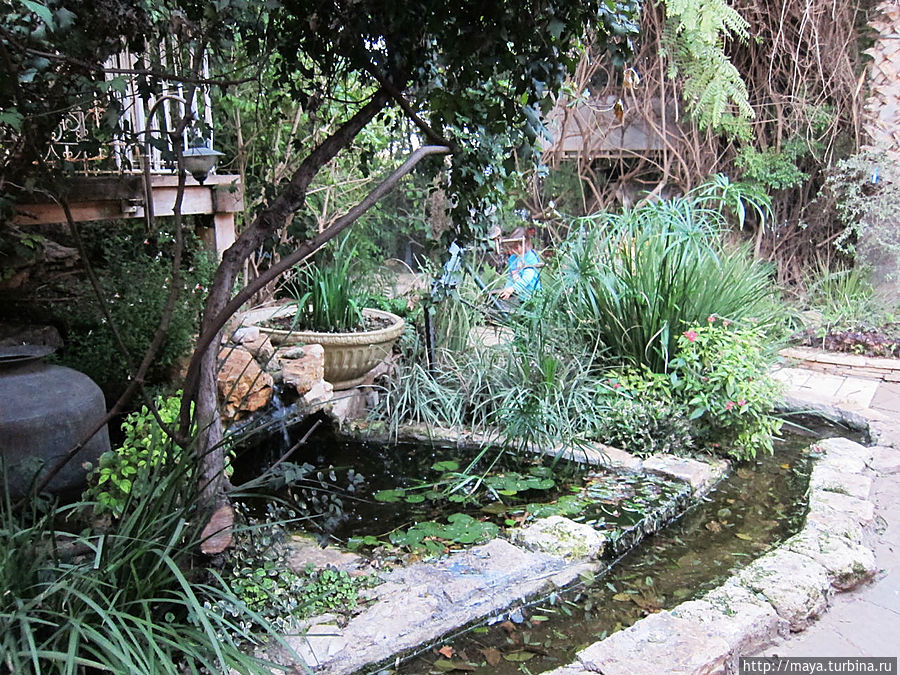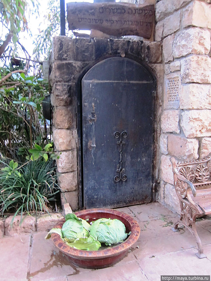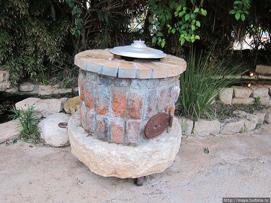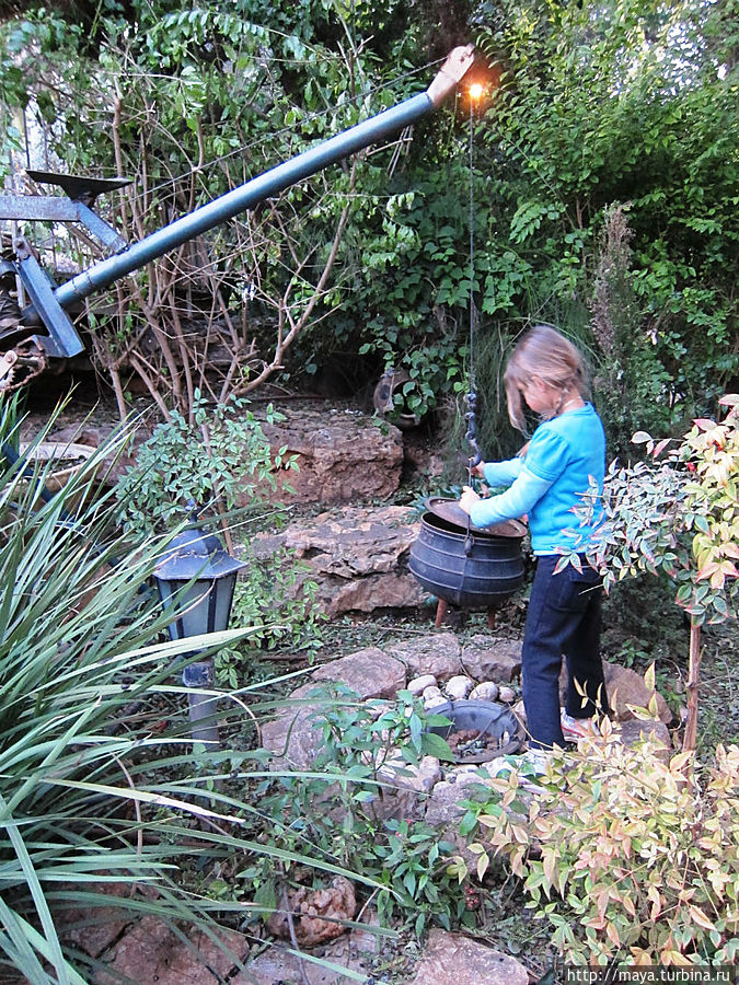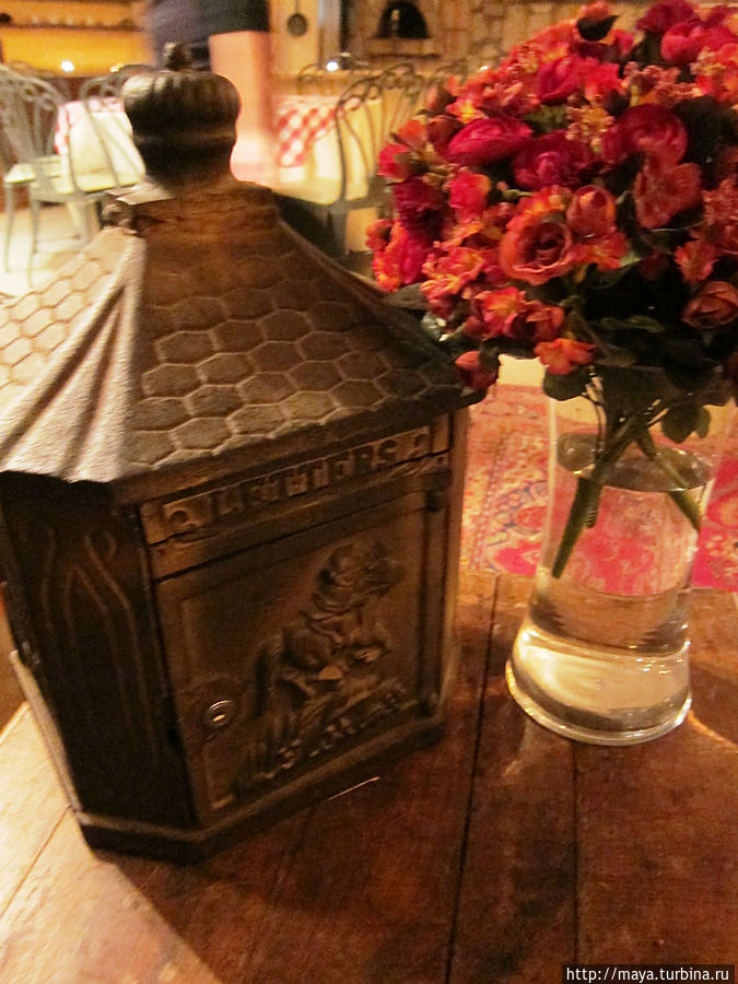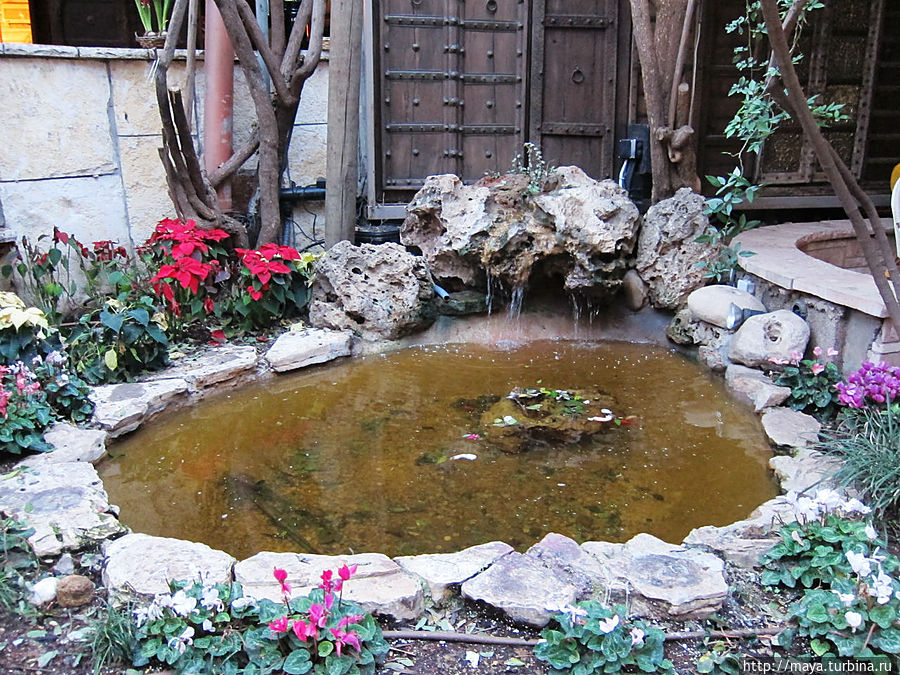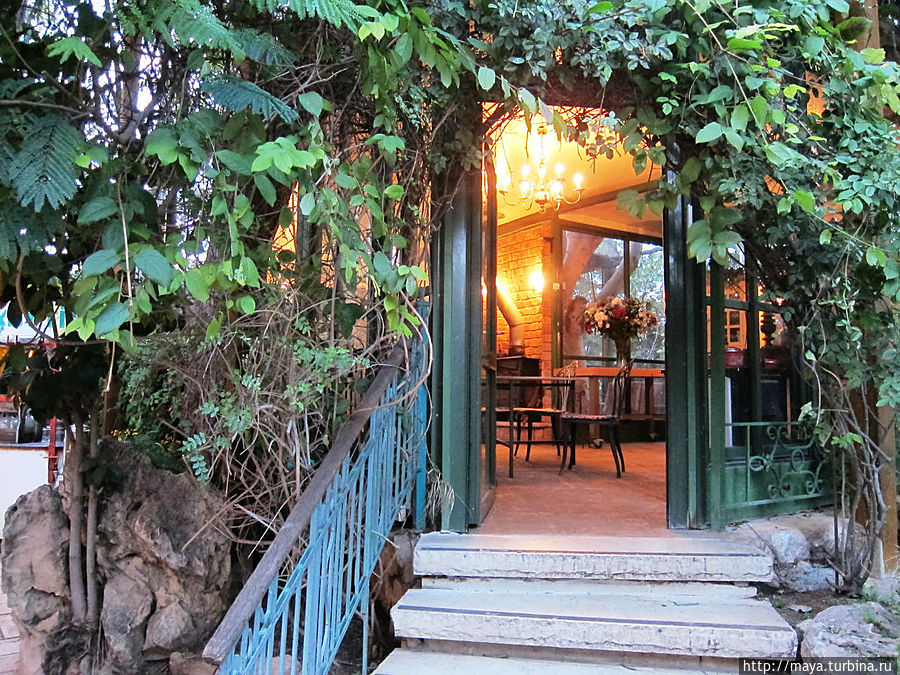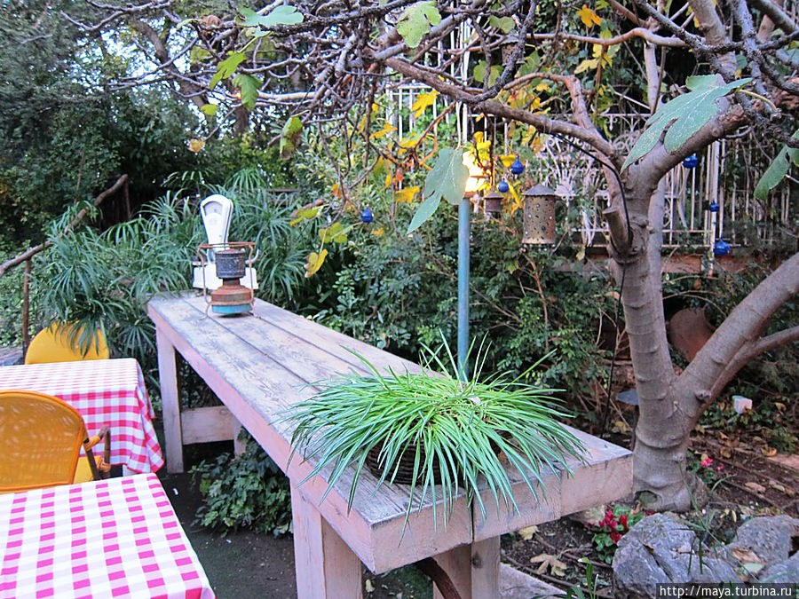 Мы проходим через сад, полный зелени, трав, запахов и звуков журчащей воды от многочисленных водопадиков. В саду стоят накрытые столы. Летом тут, наверное, хорошо: цветы, специи, запахи, птички поют. Но зимой? Холодновато. И мы идем внутрь. А там камин, живой огонь, живые цветы и несколько залов. Оставляю мужа выбирать и заказывать, а сама хватаю фотоаппарат и бегу обследовать местность. Обнаруживаю спрятавшееся в зелени кафе, очаг и печки, скамейки, старинные двери и старую утварь.