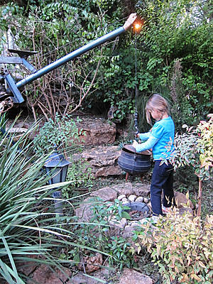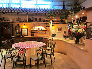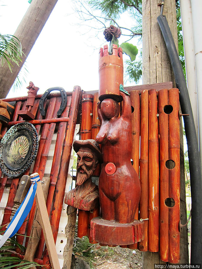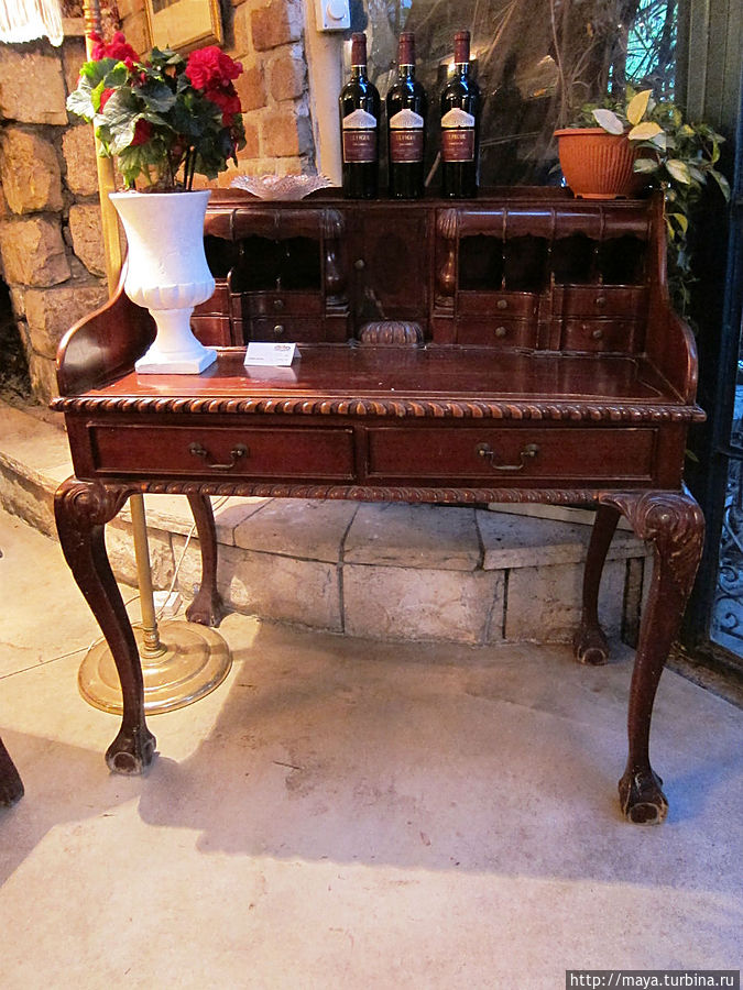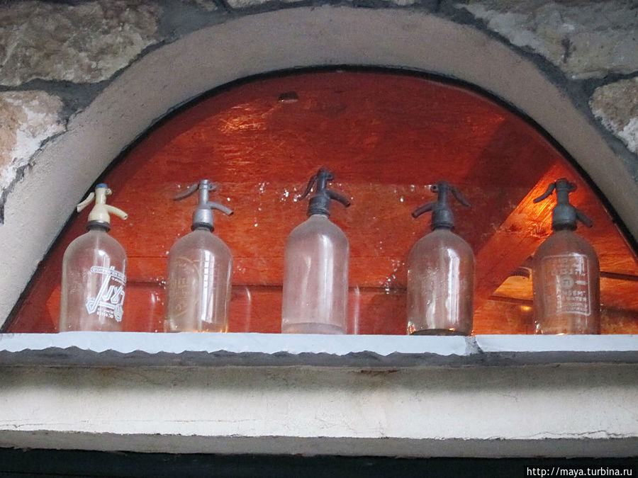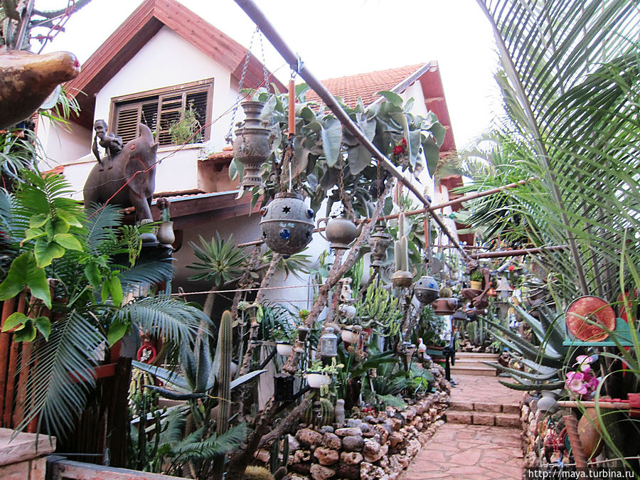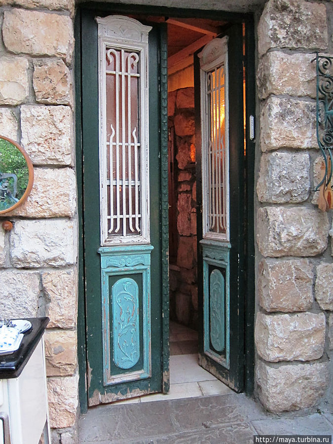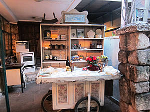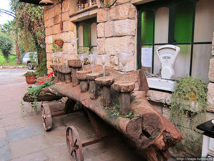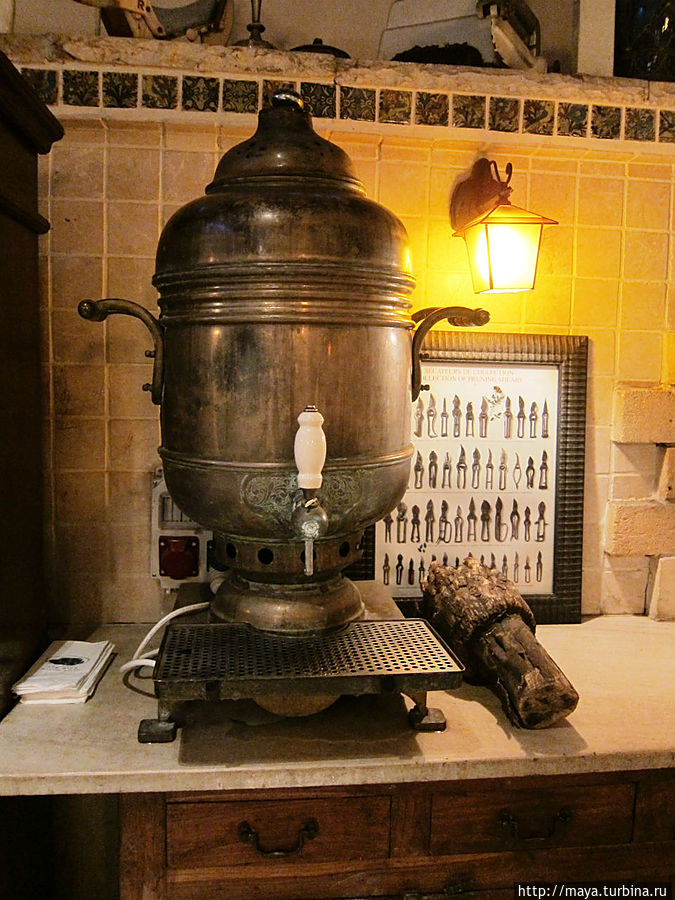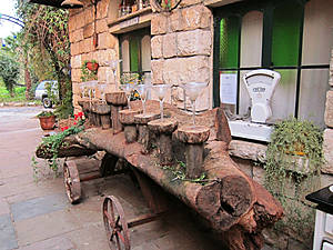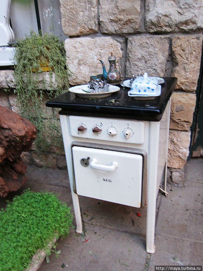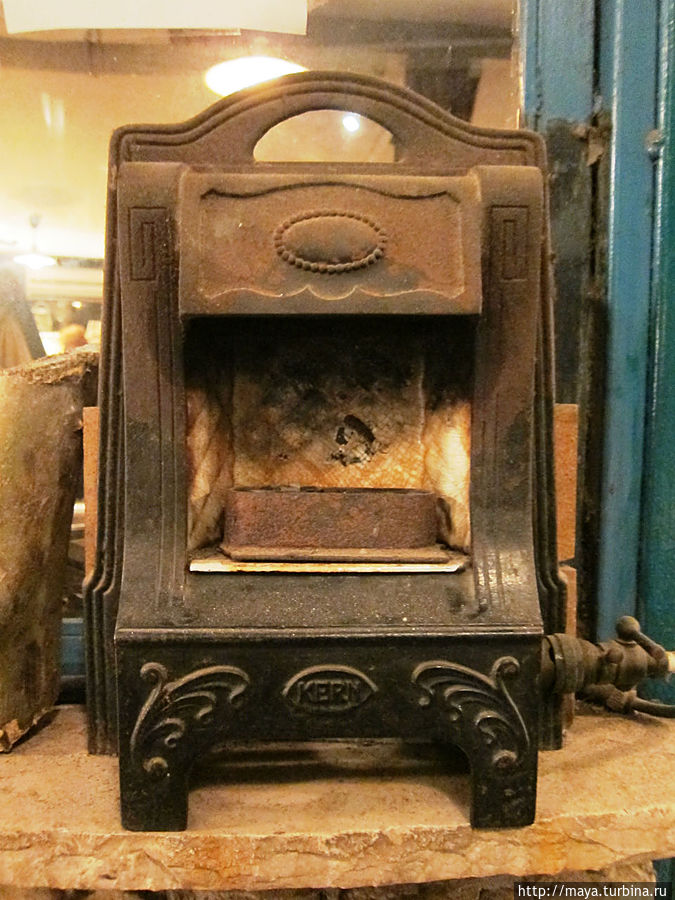 Мы проходим через сад, полный зелени, трав, запахов и звуков журчащей воды от многочисленных водопадиков. В саду стоят накрытые столы. Летом тут, наверное, хорошо: цветы, специи, запахи, птички поют. Но зимой? Холодновато. И мы идем внутрь. А там камин, живой огонь, живые цветы и несколько залов. Оставляю мужа выбирать и заказывать, а сама хватаю фотоаппарат и бегу обследовать местность. Обнаруживаю спрятавшееся в зелени кафе, очаг и печки, скамейки, старинные двери и старую утварь.