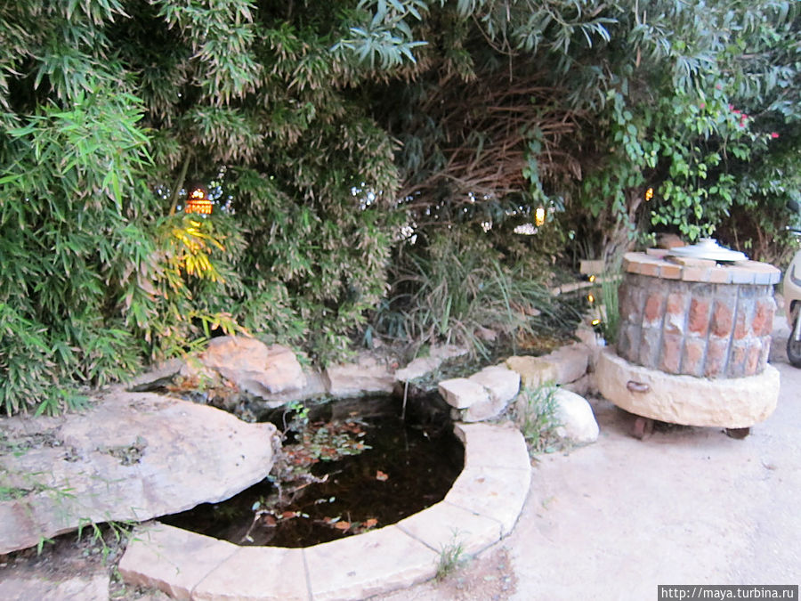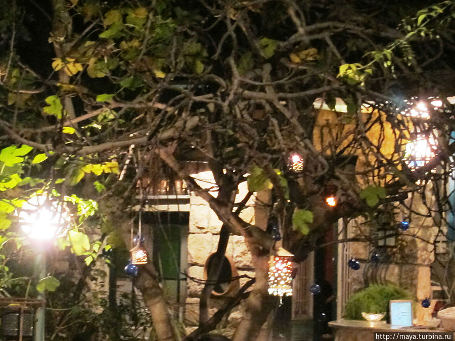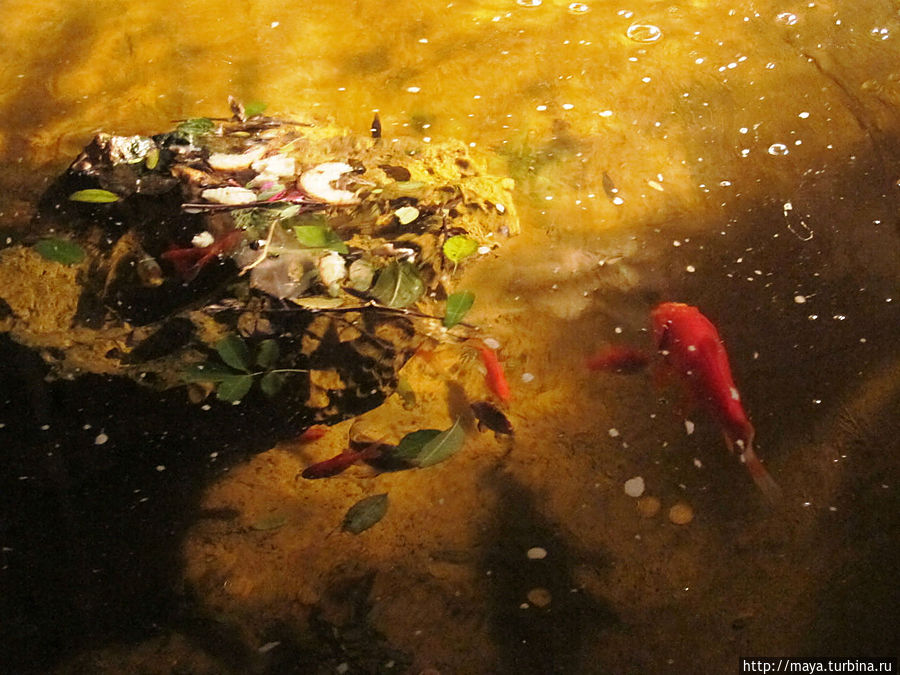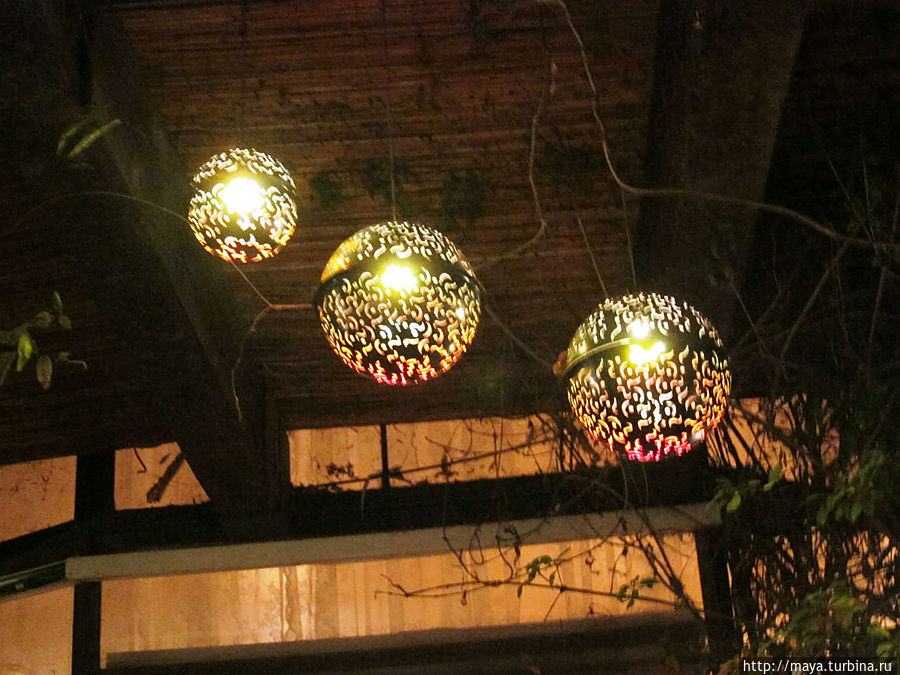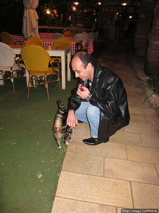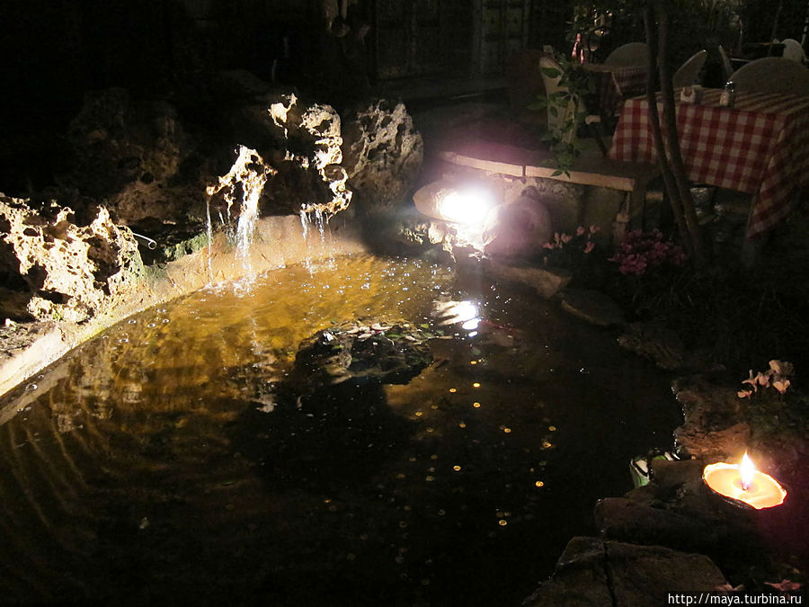 Когда мы вышли, уже стемнело, на улице, за столиками сидели люди. Горели фонарики на деревьях. Кроме флоры обнаружили тут и фауну. Рыбки, привлеченные подсветкой, показались в водопадиках. Про кошек я даже не говорю. Они, практически, лезли на руки.