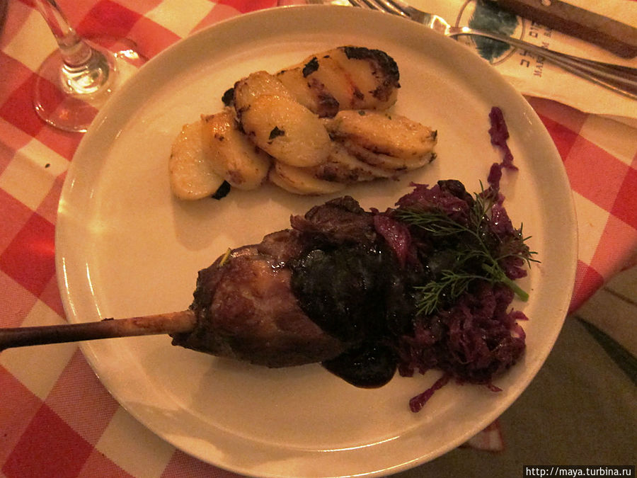 В продолжение банкета муж получил антрекот, и с тигриным рычанием защитил от моего фотоаппарата каждый из 350-ти грам. Когда мы поменялись, фотографировать уже было неинтересно. Свой кусочек гуся с красной капустой, тушеной в кальвадосе с яблоками могу показать беспрепятственно. И я не знаю, в чем тушили эту картошку, но она просто таяла во рту.