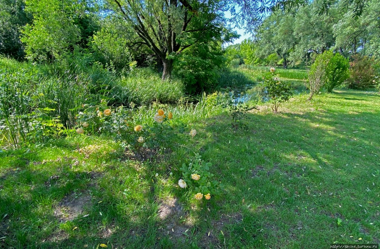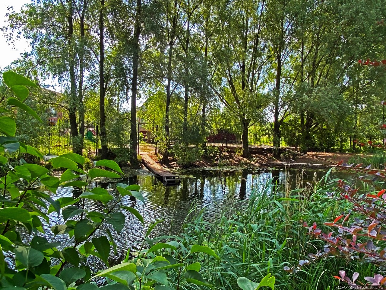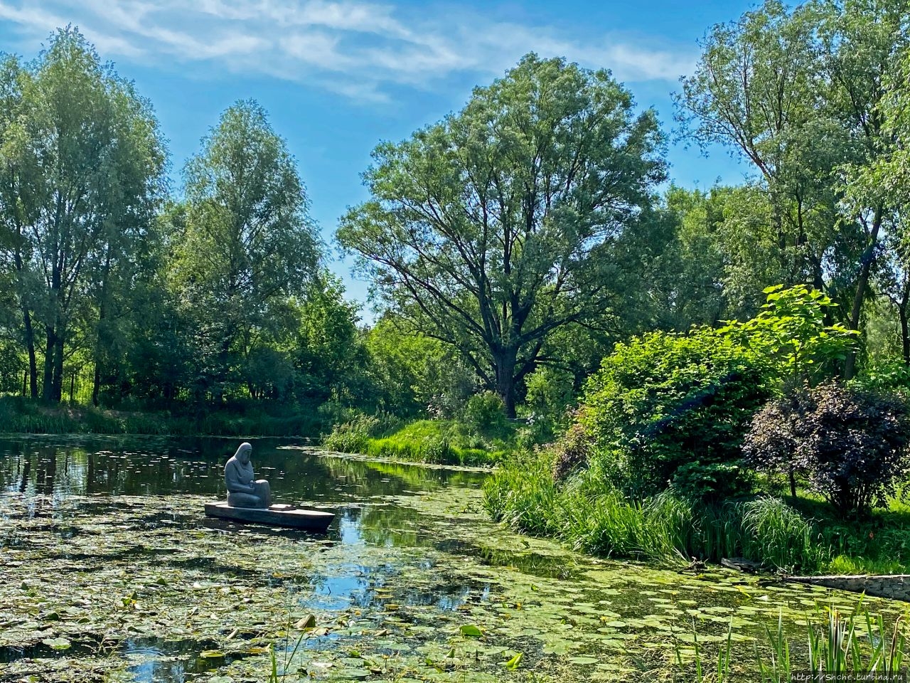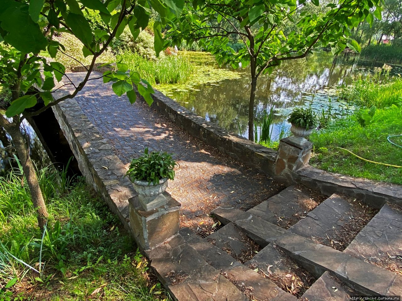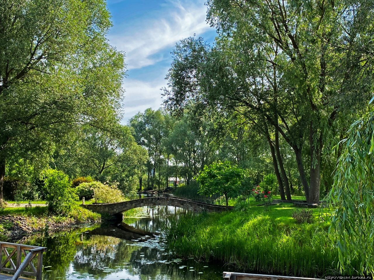 Узкие водяные протоки, мостики наряду с качественным газоном и цветочными клумбами создают уют и прохладу.