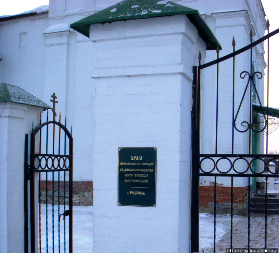 Храм преображения господня. в селе Радонеж является уникальным памятником русского архитектурного зодчества середины 19в.в он был построен 1836 г-1842г. здание имеет традиционную для приходских церквей 17-20 в.в и расположен на мысу, на берегу реки Пажи. 29 мая 1988 г. к юго-западу от Преображенской церкви села был установлен памятный знак преподобному Сергию Радонежскому . Напротив входа в храм установлен крест, стоявший на могиле святой блаженной старицы Матроны Московской. Сейчас сюда стекается множество паломников, посещающих места, связанные с житием одного из самых почитаемых и прославленных русских святых – Преподобного Сергия Радонежского, а также внизу под горой находится святой источник Сергия Радонежского. Здесь же устроена купель.